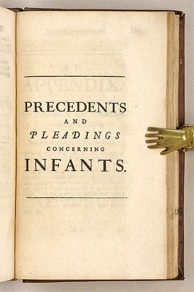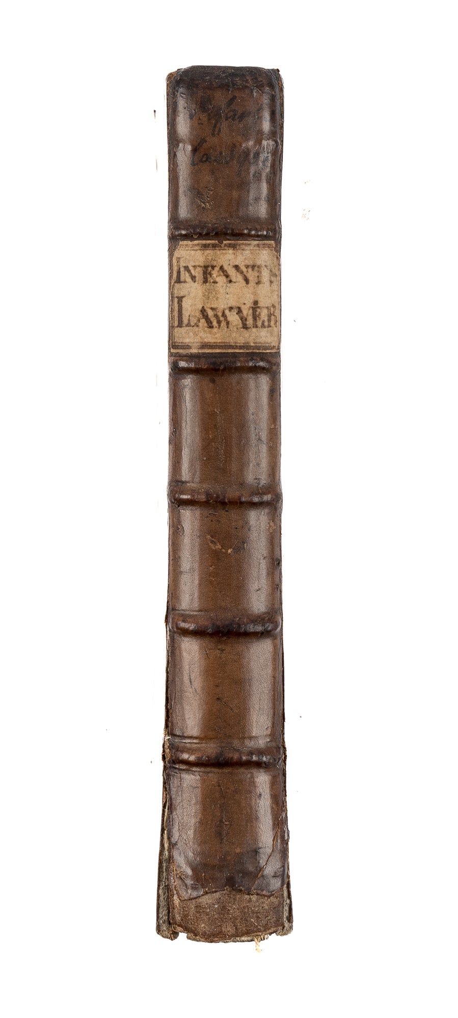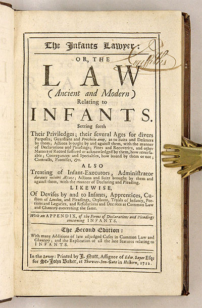 1712. London, 1712. Second edition. Rare. London, 1712. Second edition. Rare. The First English Treatise on the Law of Infants [Carter, Samuel]. The Infants Lawyer: Or the Law (Ancient and Modern) Relating to Infants. Setting Forth Their Priviledges; Their Several Ages for Divers Purposes; Guardians and Prochein Amy, As to Suits and Defences by Them; Actions Brought by and Against Them, With the Manner of Declarations and Pleadings; Fines and Recoveries, And Other Matters of Record Suffered or Acknowledged by Them, How Reversable; Conveyances and Specialties, How Bound by Them or Not; Contracts, Promises, &c. Also Treating of Infant-Executors, Administrator Durante Minori Aetate; Actions and Suits Brought by Them and Against Them, With the Manner of Declaring and Pleading. Likewise, Of Devises by and to Infants, Apprentices, Custom of London, And Pleadings, Orphans, Tryals of Infancy, Portions and Legacies, And Resolutions and Decrees at Common Law and Chancery Concerning the Same. With an Appendix, Of the Forms of Declarations and Pleadings Concerning Infants. With Many Additions of Late Adjudged Cases in Common Law and Chancery; And the Explication of All the Late Statutes Relating to Infants. [London]: Printed by J. Nutt, 1712. [xxiv], 380, [28] pp. Octavo (7-1/2" x 4-1/2"). Contemporary calf, blind rules to boards, blind fillets along joints, raised bands and early hand-lettered paper title label and faint early hand-lettered title to spine. A few minor nicks and scuffs to boards. some rubbing to extremities, chip to foot of spine, corners bumped and lightly worn, joints starting, hinges cracked. Light toning to text, light foxing to a few leaves, early owner signature ("Griffiths"?) to head of title page. $2,500. * Second edition. First published in 1697, this is the first English treatise on the subject. Its twenty comprehensive chapters consist of a digest of the case law relating to each topic with explanatory comments. Holdsworth notes that "[i]t was a useful book to practitioners since it covers all the topics connected with its subject." A third edition was published in 1726. All editions are scarce. Holdsworth, A History of English Law XII:399-400. English Short-Title Catalogue T86178.