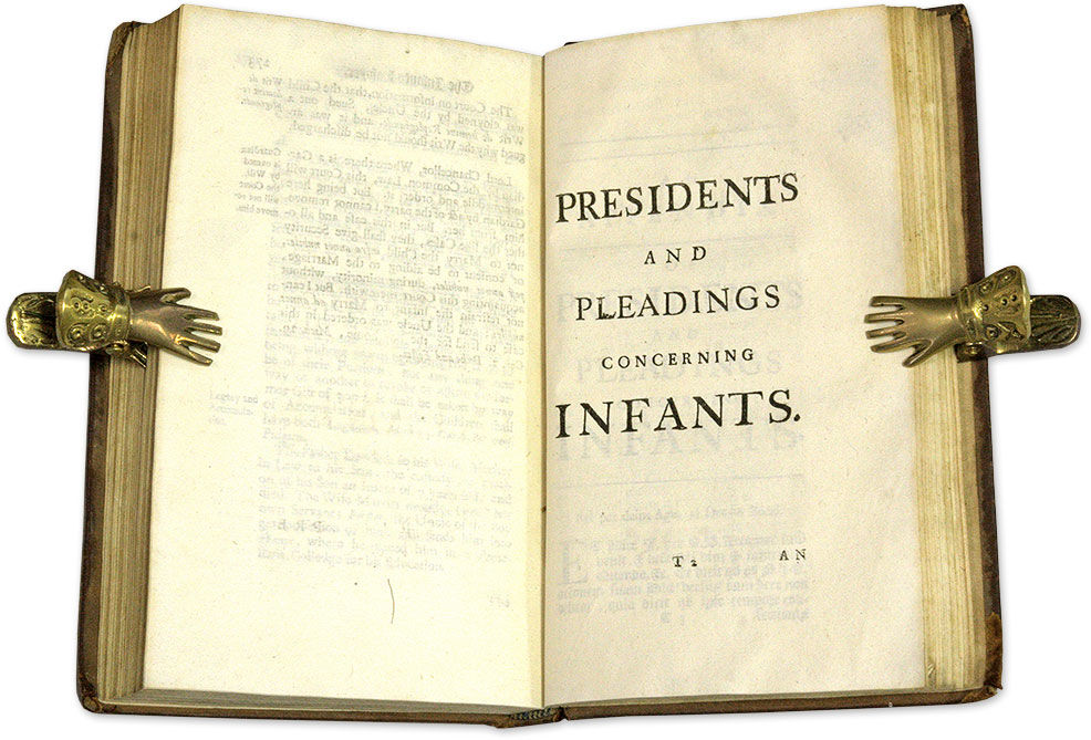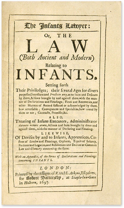 1697. London, 1697. Rare. London, 1697. Rare. First Edition of the First English Treatise on Laws Concerning Infants [Carter, Samuel]. The Infants Lawyer: Or, The Law (Both Ancient and Modern) Relating to Infants. Setting Forth Their Priviledges; Their Several Ages for Divers Purposes; Guardians and Prochein Amy, As to Suits and Defences by Them; Actions Brought by and Against Them, With the Manner of Declarations and Pleadings; Fines and Recoveries, And Other Matters of Record Suffered or Acknowledged by Them, How Reversable; Conveyances and Specialties, How Bound by Them or Not; Contracts, Promises, &c. Also, Treating of Infant-Executors, Administrator Durante Minori Aetate; Actions and Suits Brought by Them and Against Them, With the Manner of Declaring and Pleading. Likewise, Of Devises by and to Infants, Apprentices, Custom of London and Pleadings, Orphans, Tryals of Infancy, Portions and Legacies, And Resolutions and Decrees at Common Law and Chancery Concerning the Same. With an Appendix, Of the Forms of Declarations and Pleadings Concerning Infants. London: Printed by the Assigns of R. and E. Atkyns, Esquires, 1697. [xxxii], 303, [41] pp. Octavo (7-1/2" x 4-1/2"; 19 x 11.4 cm). Contemporary calf, blind rules to boards, raised bands and fragment of paper title label to spine, gilt tooling to board edges. A few minor nicks and scratches to boards, light rubbing to extremities, wear to head of spine, joints starting, corners bumped and somewhat worn, front hinge starting, interior notably fresh. A handsome copy. $4,500. * First edition. This is the first English treatise on the subject and the first copy of this edition we have seen in 40 years. Its twenty comprehensive chapters consist of a digest of the case law relating to each topic with explanatory comments. Holdsworth notes that "[i]t was a useful book to practitioners since it covers all the topics connected with its subject." A third edition was published in 1726. All editions are scarce. Holdsworth, A History of English Law XII:399-400. English Short-Title Catalogue R32363.