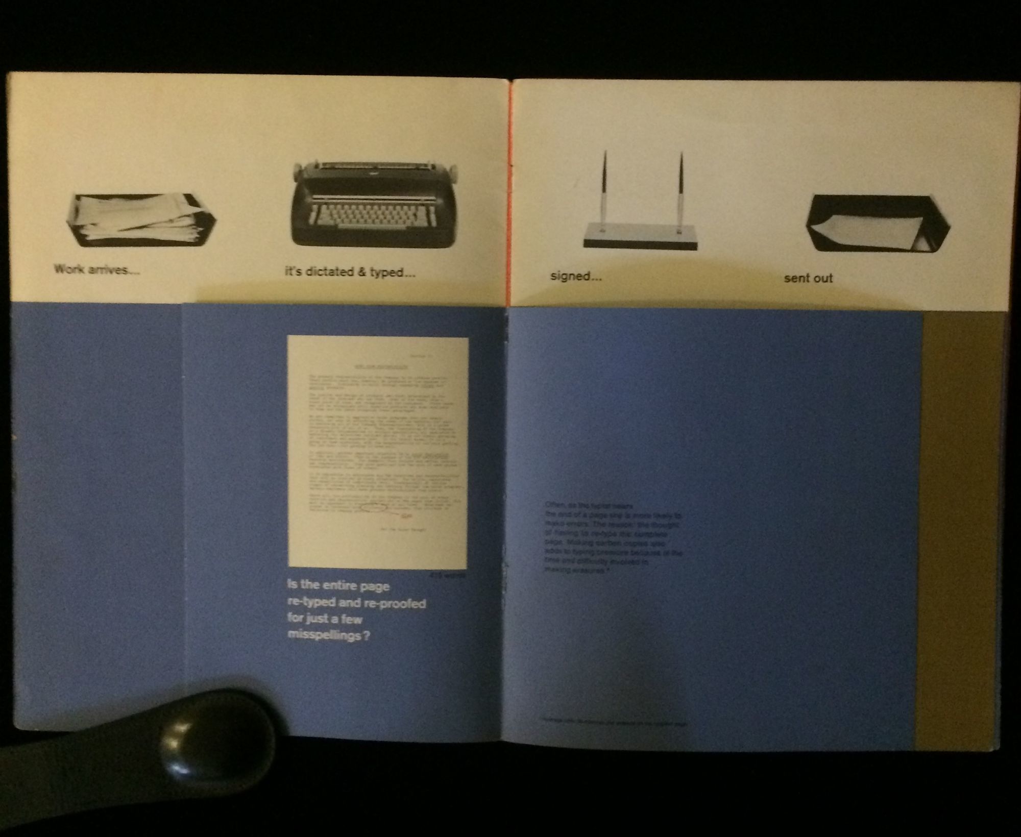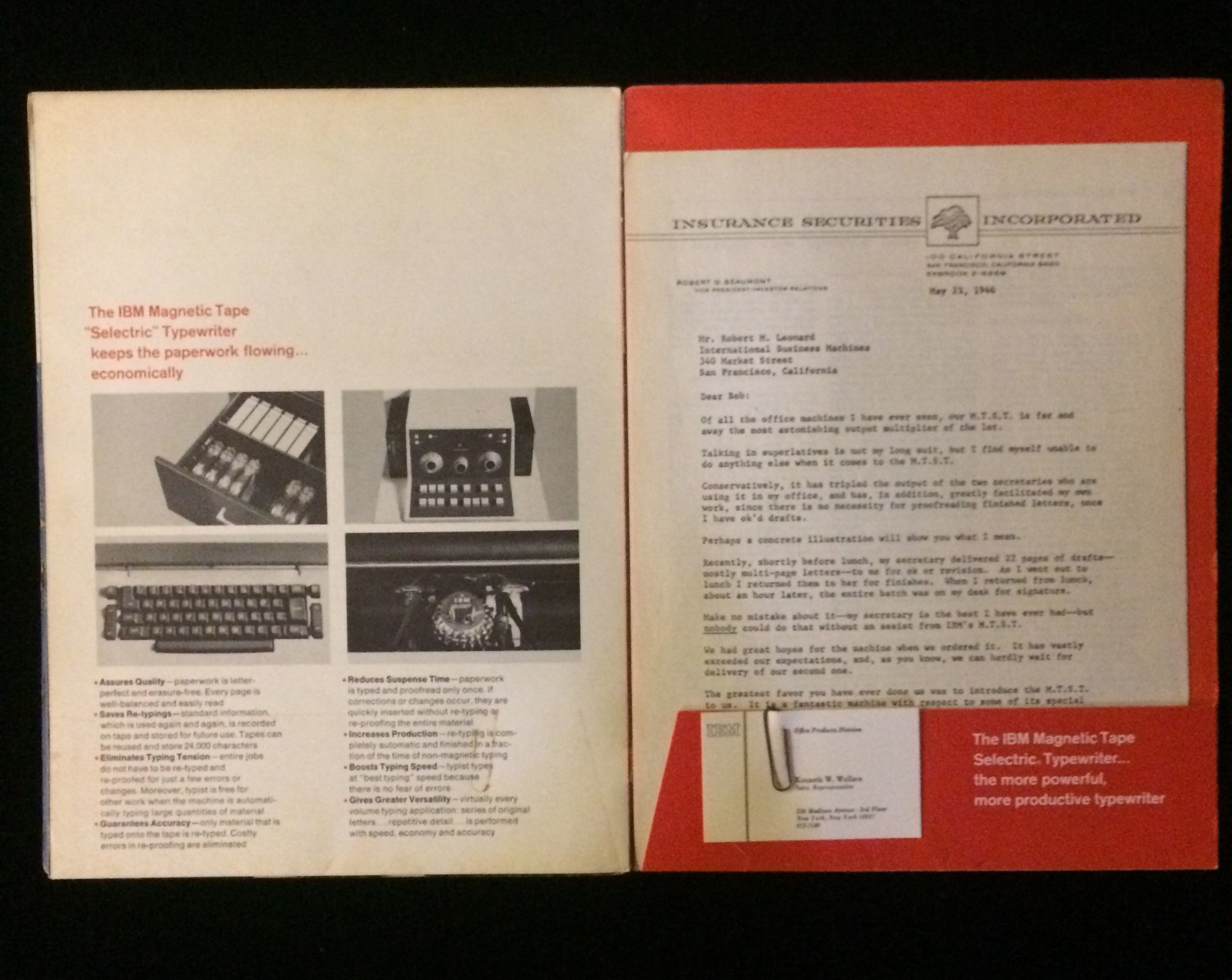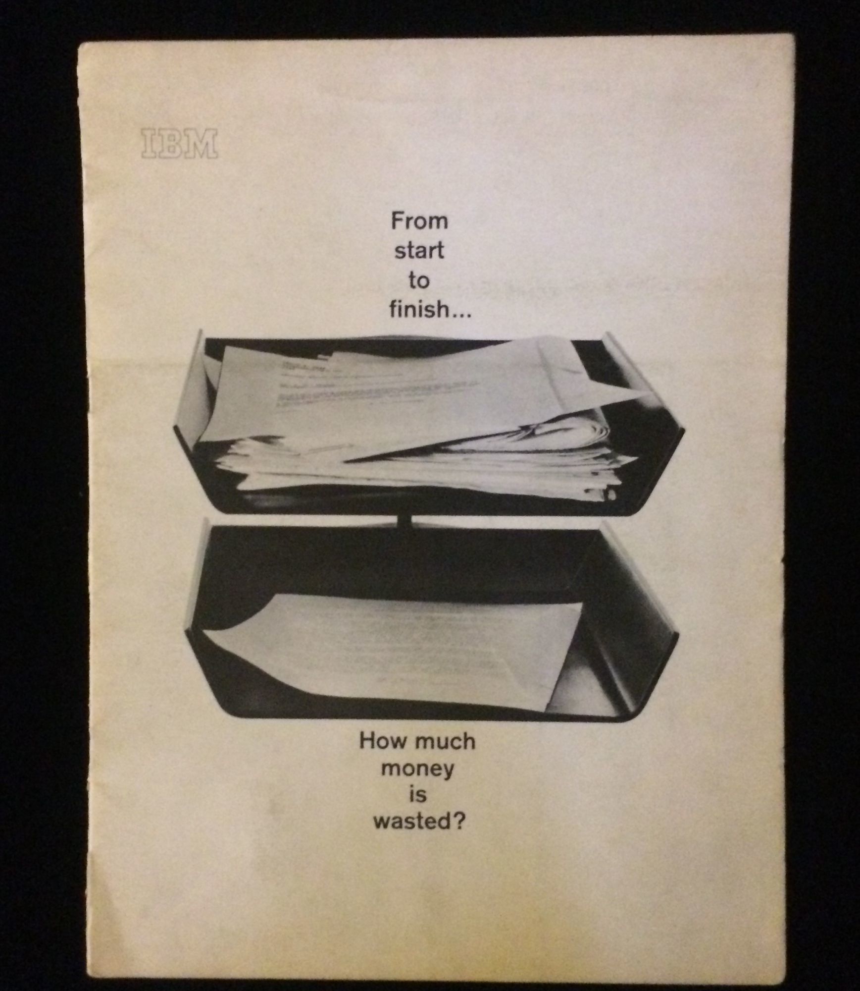IBM Office Products Division, 1966. 1st Edition. Soft cover. Very Good. Sales catalogue, undated, c 1966, for IBM office equipment which can make the office run more economical. Stiff paper, 9"x 12", printed covers, stapled spine, 10 pages, one double fold out, chronicling the route of a memo through an office system and the specific IBM office product needed at every step. Typical IBM graphics and design. Covers moderately soiled, spiensplit at bottom one inch, internals fine. With sales rep business card inserted rear pocket.