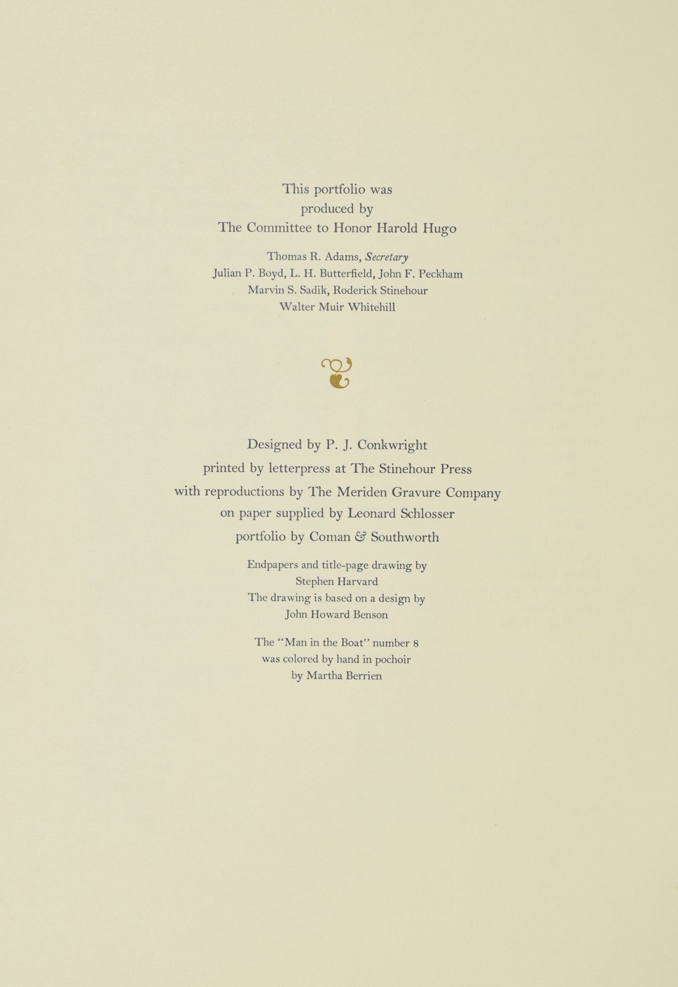 N.P., 1978. Near Fine binding. A remarkable festschrift honoring a remarkable printer. Harold Hugo's contributions to the twentieth-century printing, through his work at the Meriden Gravure Company, were immense. Comprise of 36 numbered fascicles as wells the Foreward and Epilogue, housed in a clamshell case of terra-cotta silk lined with patterned paper, and with a leather label. The label has a small amount of wear. Near Fine binding.
