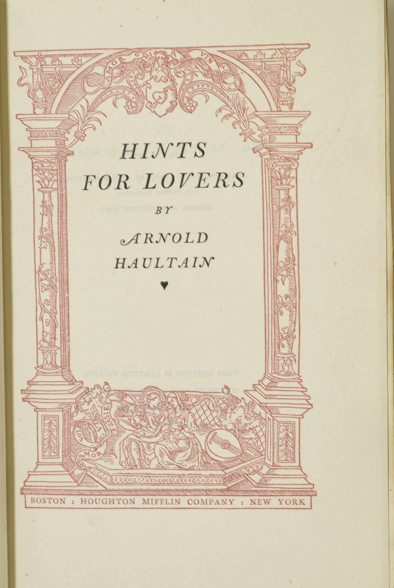 Boston | New York: Houghton Mifflin Company, 1909. Hard Cover. Near Fine binding. A very nearly fine copy, still with the publisher's glassine wrapper. In pale pink paper-covered boards, with a mauve paper spine label letters in gilt. On the pastedown is residue from a bookplate, and a small cream colored bookplate printed in gilt. Near Fine binding.