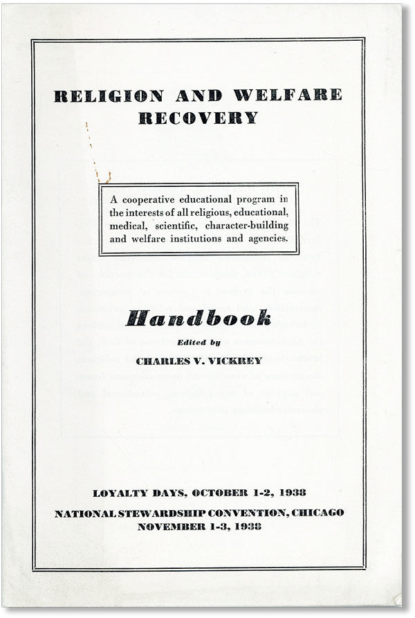 Chicago: [National Committee for Religion and Welfare Recovery], 1938. First Edition. Octavo. Staple-bound printed wrappers; 31pp. Minor creasing to covers at corners, else Near Fine. Handbook distributed to attendees of the National Stewardship Convention in Chicago, Nov. 1-3 1938. Numerous allegorical illustrations in text. Religious revival as a cure for economic depression. Uncommon; 2 only in OCLC, no others in commerce (2018).