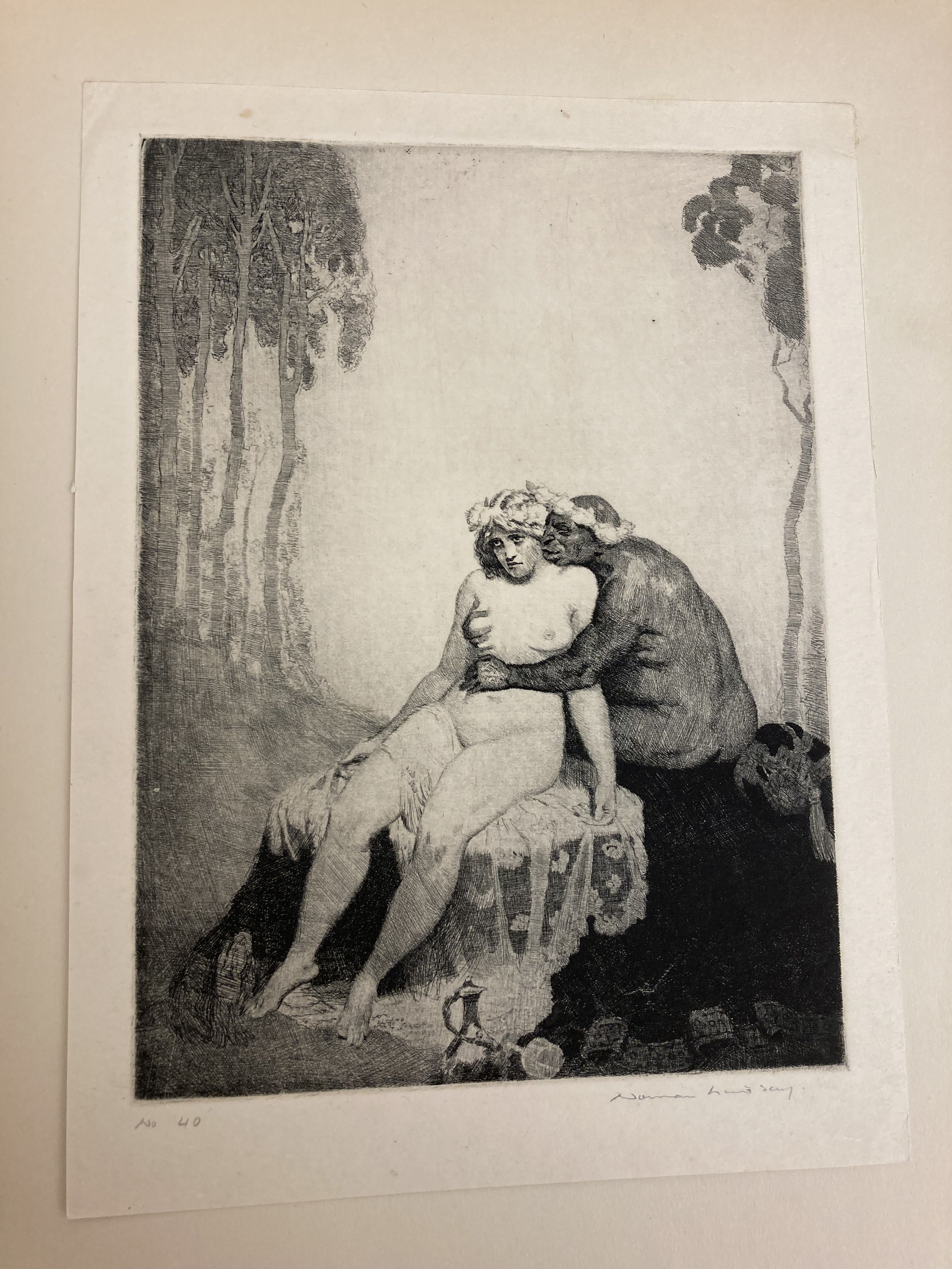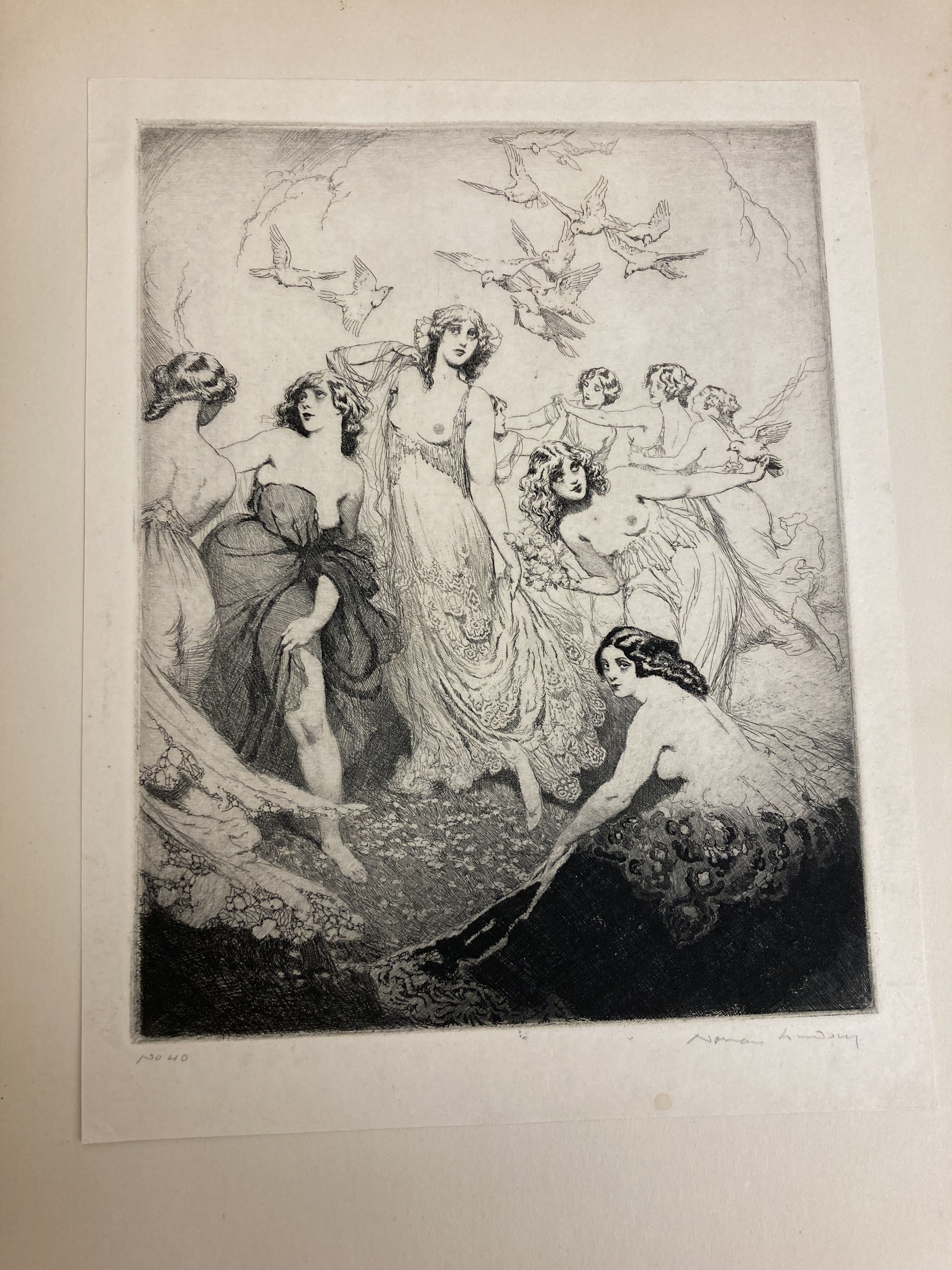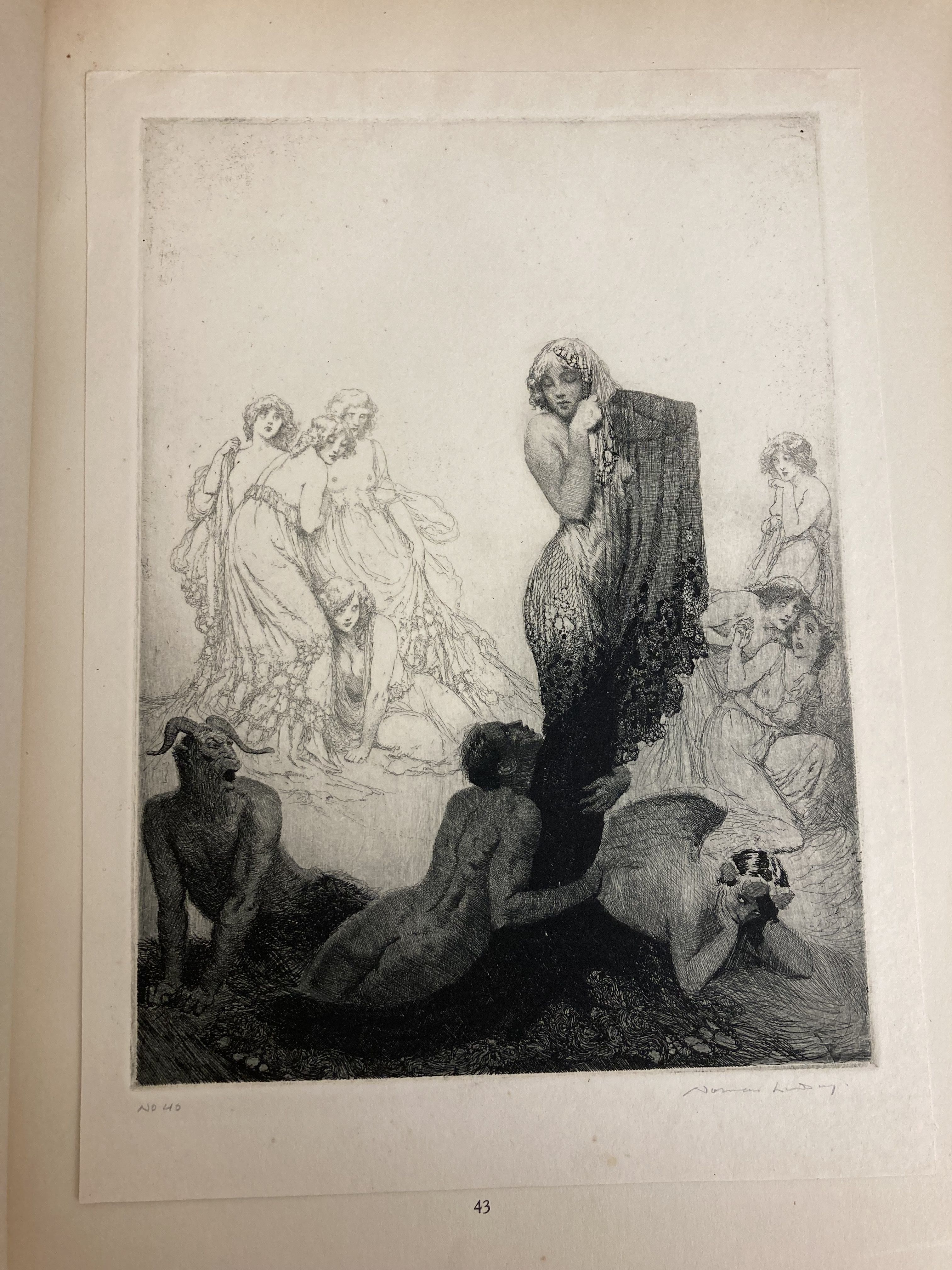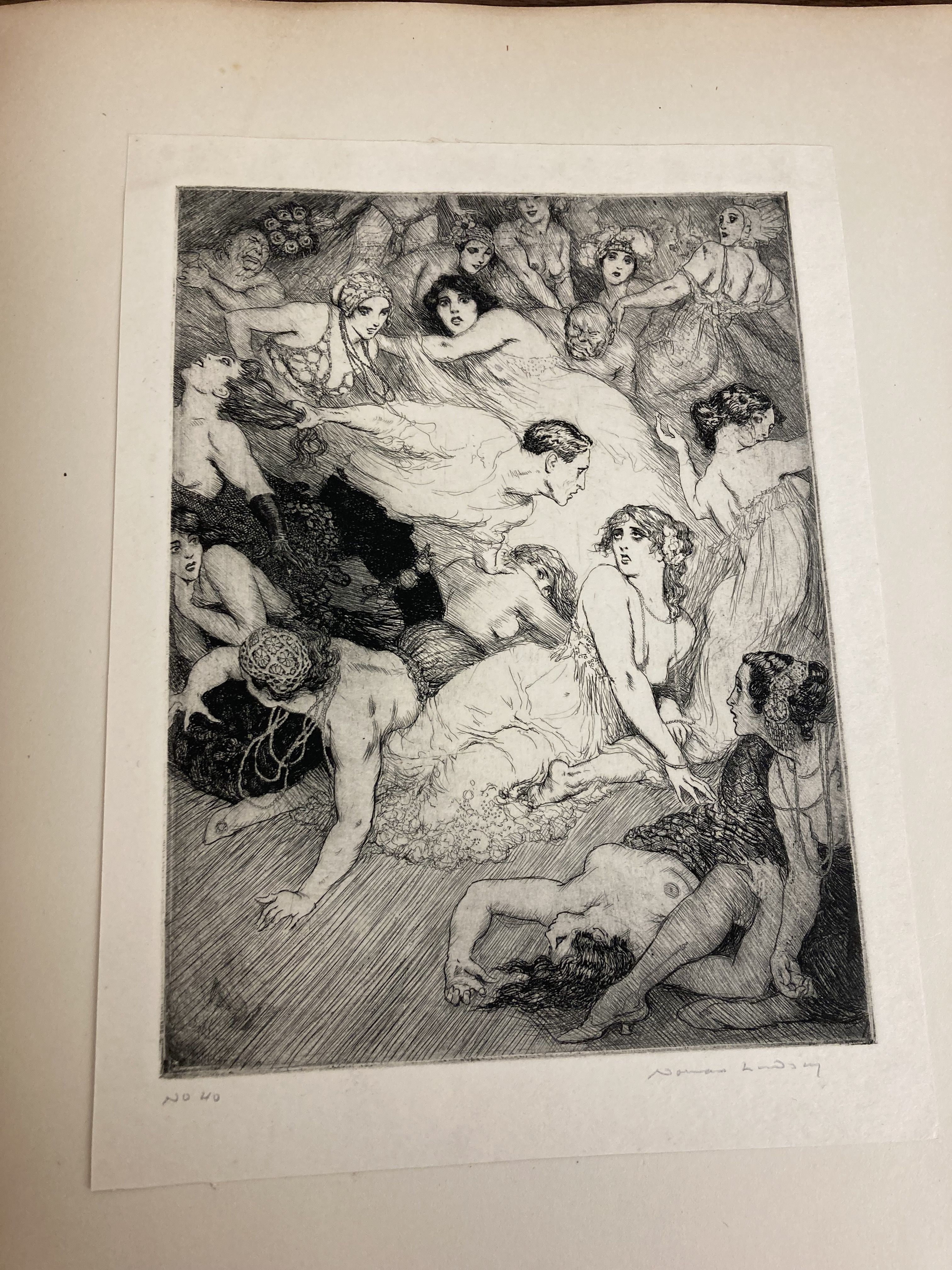 Sydney, Australia: Art in Australia, 1919. First Edition. Hardcover. Fair. Signed. Signed by Author and Illustrator Limited Edition #40 of 120 copies. Signed by Leon Gellert. Includes all 5 etchings signed and numbered by Norman Lindsay in pencil as well as the frontispiece portrait. All tissue guards are present with the tissue for the illustration on page 35 (The Dance of Innocence) having a several inch tear running up from the bottom edge toward the gutter. This copy needs to be rebound- needs to be re-backed (cream vellum), green cloth boards are rubbed through at the corners with moderate soiling. Front hinge is nearly cracked and rear hinge is only slightly better. Text block binding is good. No marks or notations. Light foxing. 139 pp. 37.5 x 28 x 2 cm. 1919. Feel free to inquire.