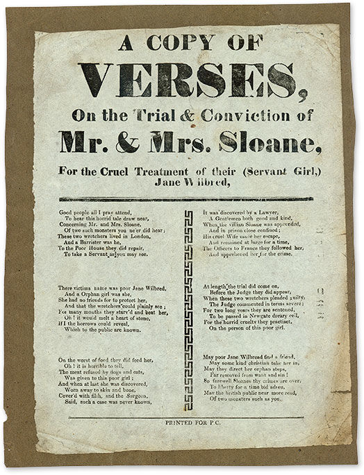 1851. [London?, 1851]: Printed for P.C.. [London?, 1851]: Printed for P.C. One of the Most Appalling Examples of the Sadistic Abuse of a Minor [Broadside]. [Great Britain]. [Child Abuse]. A Copy of Verses, on the Trial & Conviction of Mr. & Mrs. Sloane, for the Cruel Treatment of their (Servant Girl,) Jane Wilbred. [London?: Printed for P.C., 1851]. 9" x 7" verse broadside, untrimmed, mounted on paper. Main text in two columns separated by rules below boldface headline. Light soiling and a few minor creases and tears. $950. * This broadside records one of the most appalling examples of child abuse in English history. Public outrage at this case was shared at all levels of society. The gratuitous, truly unspeakable cruelties that George Sloane, special pleader of the Middle Temple and officer of the Church of England Assurance Institute, and his wife, an ex-dancer at the Italian Opera, inflicted for two years on their servant girl, who was hired from the work-house at age 15, did not go unpunished. But the Sloanes received only a two-year prison sentence. Their mild punishment outraged the public. This event must have inspired several broadsides and related items, but almost none are recorded in the standard sources. Library Hub lists 6 holdings of our broadside, all in Great Britain, OCLC locates none in North America.