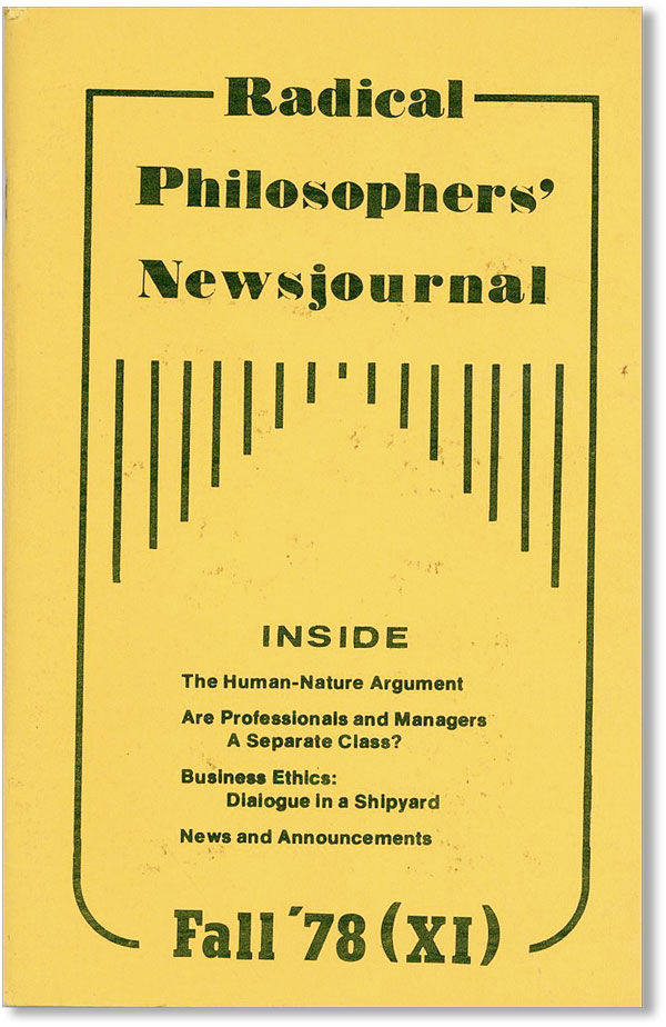 Somerville, MA: Radical Philosophers' Newsjournal, 1978. Staple-bound card wrappers (softcover); 56pp. Moderate external soiling, else Near Fine. Articles by Milton Fisk ("The Human Nature Argument"); Richard Schmitt ("Are Professionals and Managers a Separate Class?"); Jethro Hayes ("Business Ethics; Dialogue in a Shipyard"). Uncommon. OCLC catalogue suggests that this was the final issue.