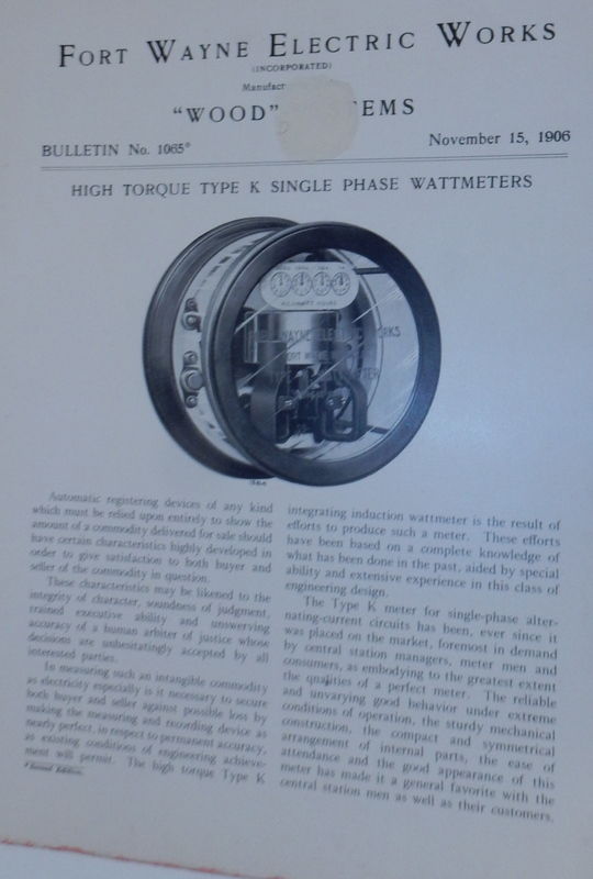 Fort Wayne, Indiana: Fort Wayne Electric Works, 1906. Staplebound. Good. 8 pages, stapled and two-hole punched. 8 x 10 1/2 inches. Page edges trimmed and stained red. Dampstained. Paper affixed to front page covering the word "Systems" in the title. Staplebound. The second edition of this bulletin. Illustrated. Focused on the accurate measurement of "an intangible commodity as electricity." An early incarnation of meters used to measure electricity use.