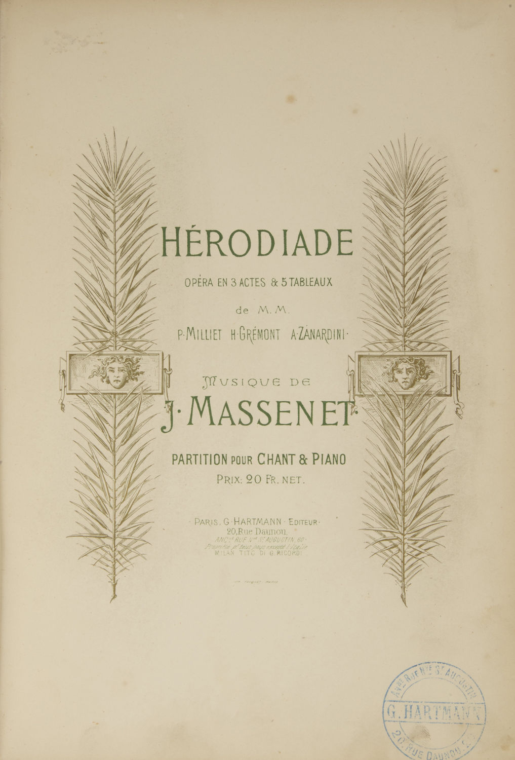 Hérodiade Opéra en 3 Actes & 5 Tableaux de M. M. P. Milliet H. Grémont A. Zánardini ... Partition pour Chant & Piano Prix: 20 Fr. net. [Piano-vocal score]