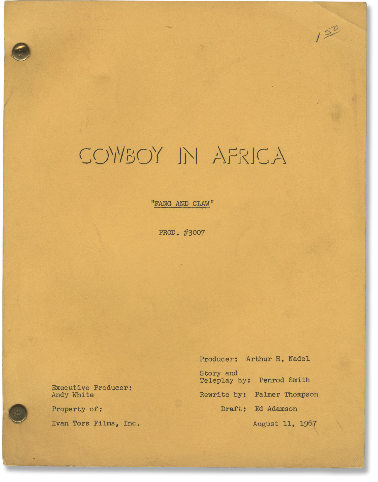 Yellow titled wrappers, rubber-stamped production No. 3007, dated August 11, 1967, with credits for producer Arthur H. Nadel, screenwriters Penrod Smith, Palmer Thompson, and Ed Adamson. 63 leaves, with last page of text numbered 63. Mechanical duplication. Pages Near Fine, wrapper Near Fine bound with two gold brads.