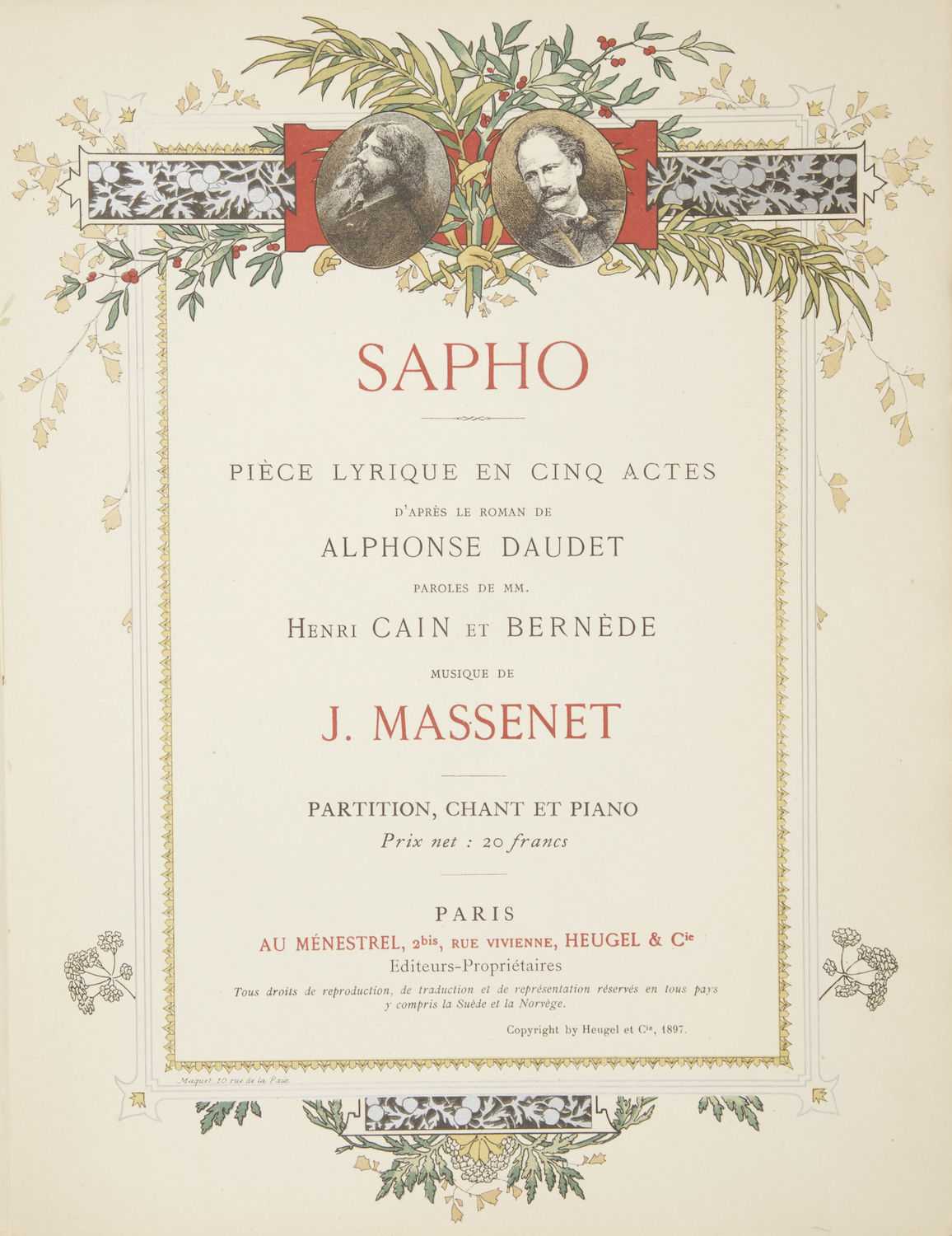Sapho, to a libretto by Cain and A. Bernède after A. Daudet, was first performed in Paris at the Opéra-Comique on 27 November 1897, under the direction of M. Léon Carvalho, and reprised on 22 January 1909, under the direction of M. Albert Carré.