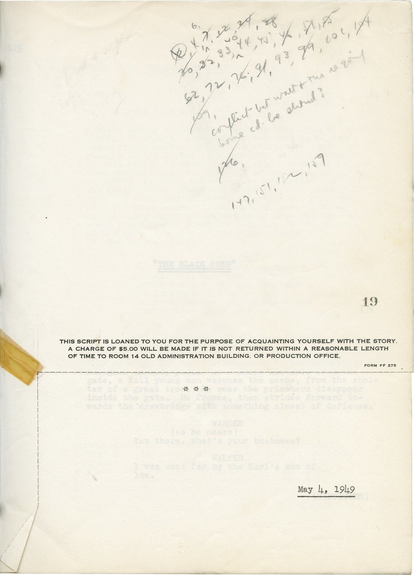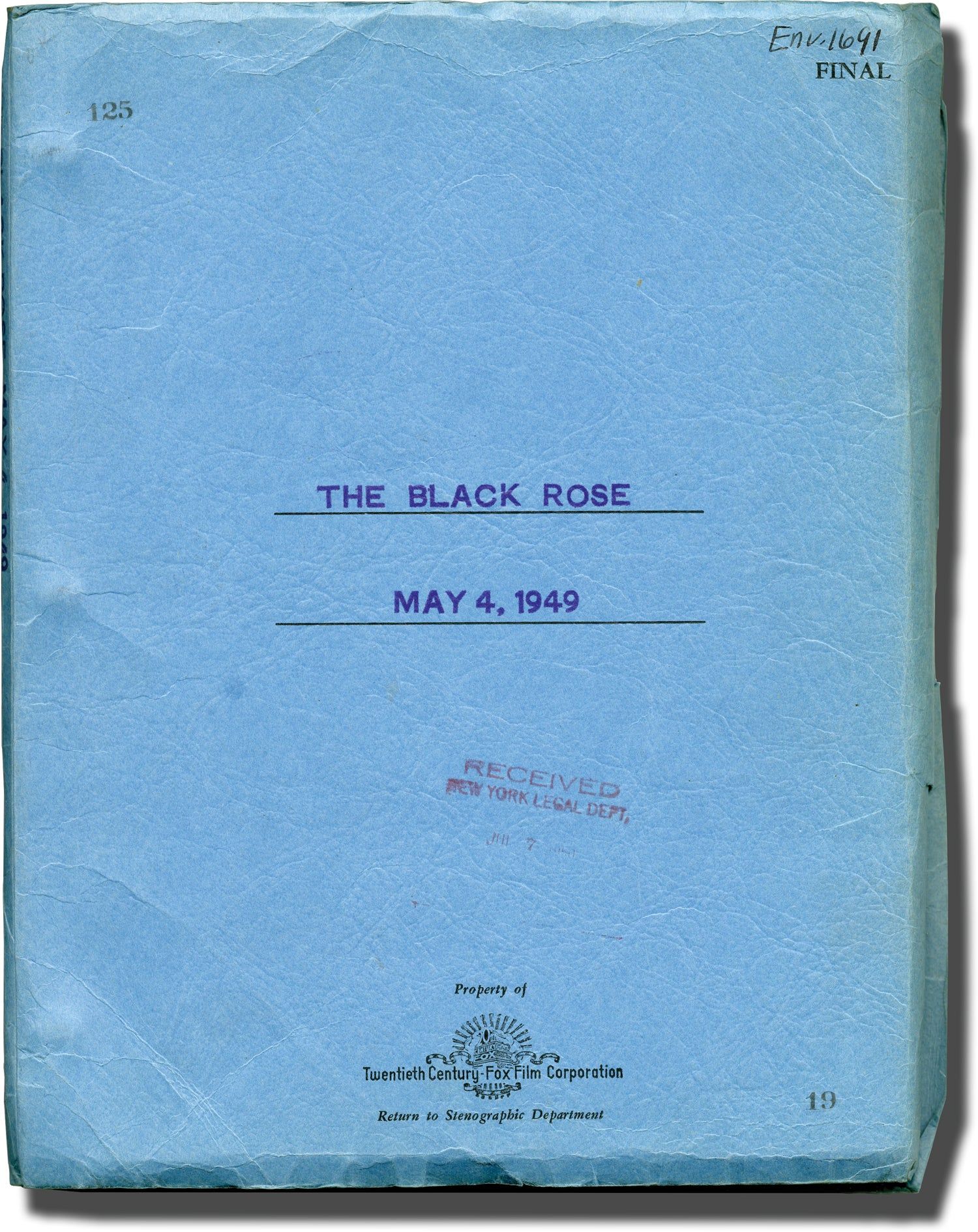 Los Angeles: Twentieth Century-Fox, 1949. Final Draft script for the 1950 film. With a "New York Legal Department" rubber stamp on the front wrapper and extensive manuscript pencil annotations throughout, likely by a professional reader, regarding differences between the source novel by Thomas B. Costain and the script.
