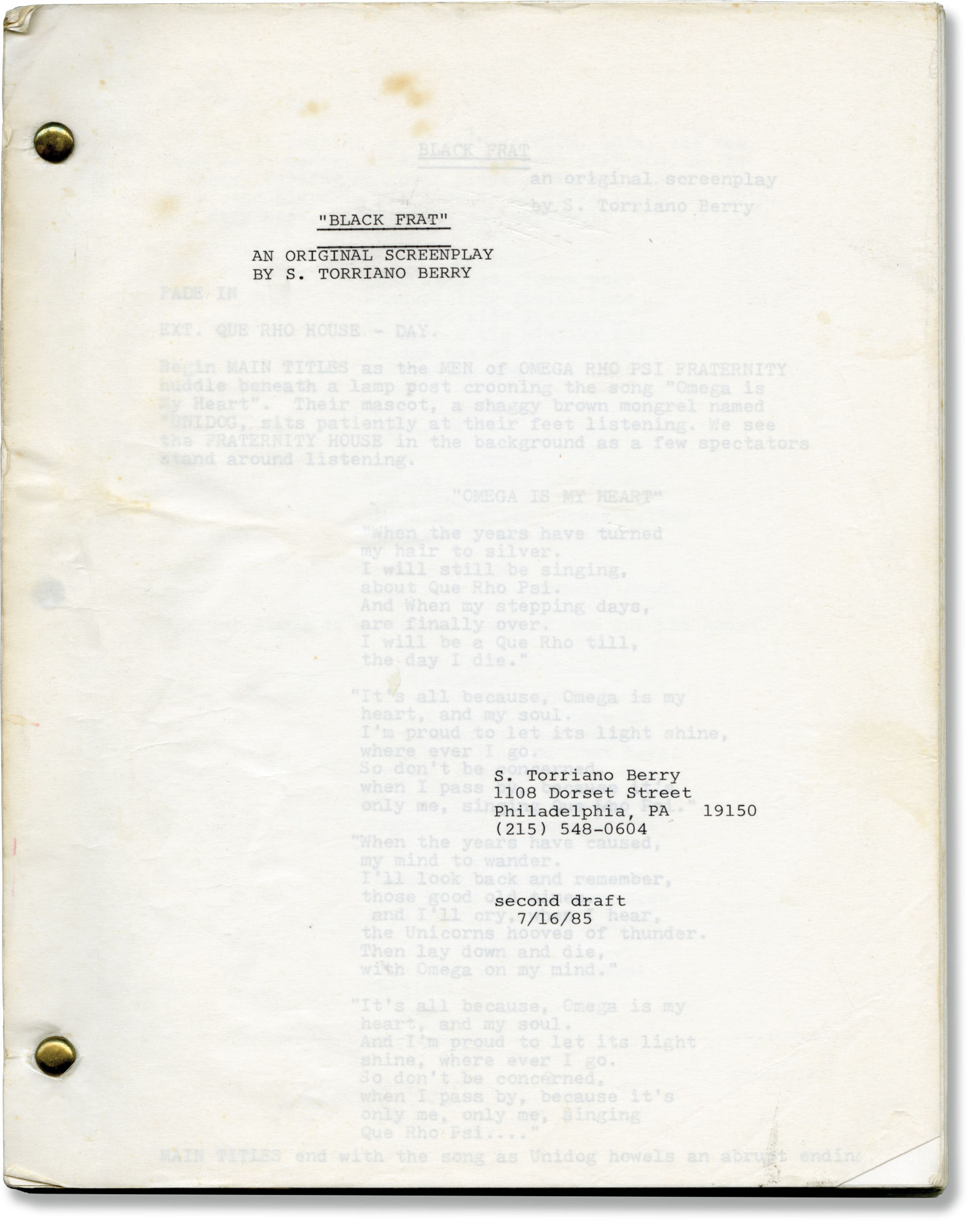Title page present, dated 7/16/85, noted as Second Draft, with credits for screenwriter S. Torriano Berry. 123 leaves, with last page of text numbered 120. Xerographically reproduced. Pages Near Fine overall, rear wrapper Very Good plus, bound with two gold brads.