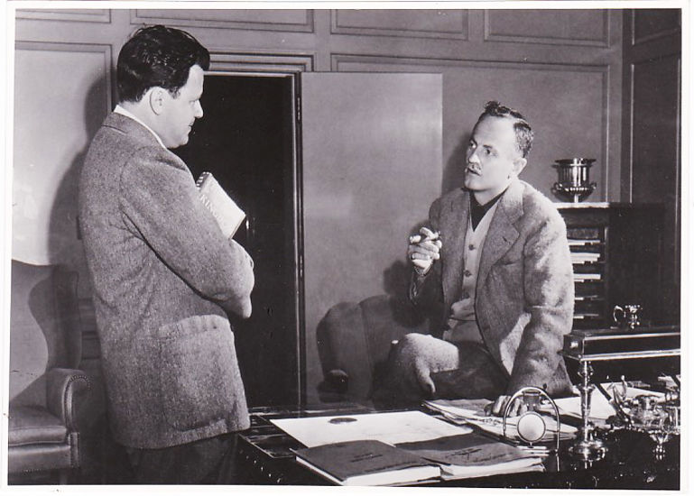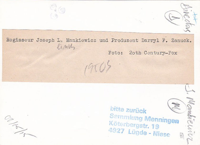 N.p.: N.p., 1950. Vintage photograph of director Joseph L. Mankiewicz and producer Darryl F. Zanuck, circa 1950. Mimeo snipe with manuscript annotations and agency stamp on the verso.