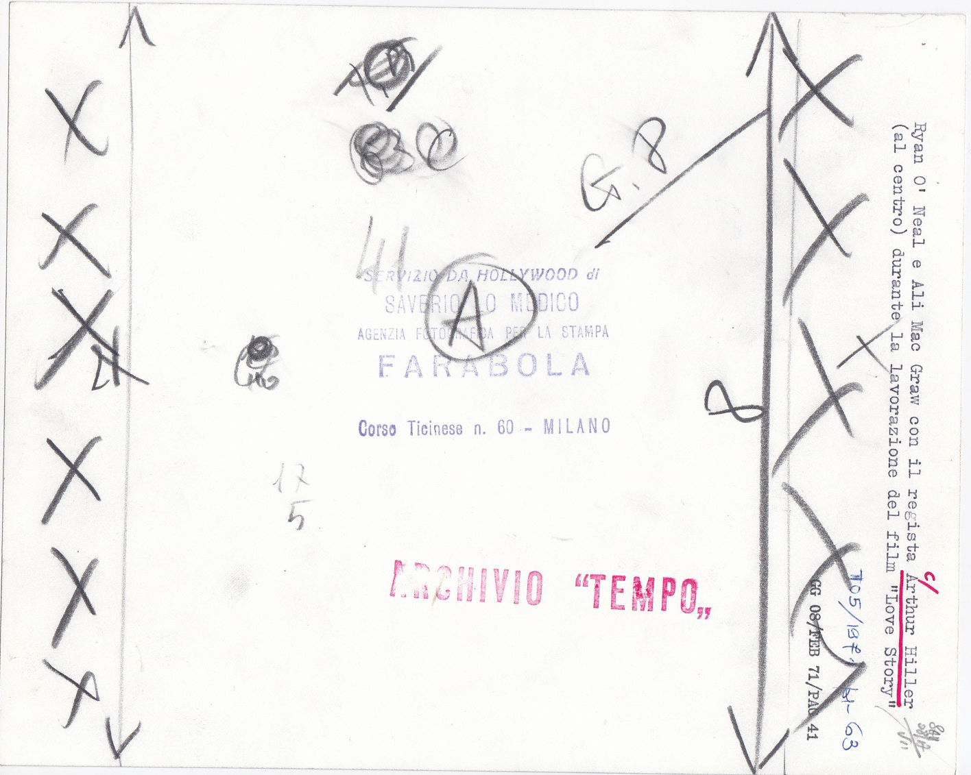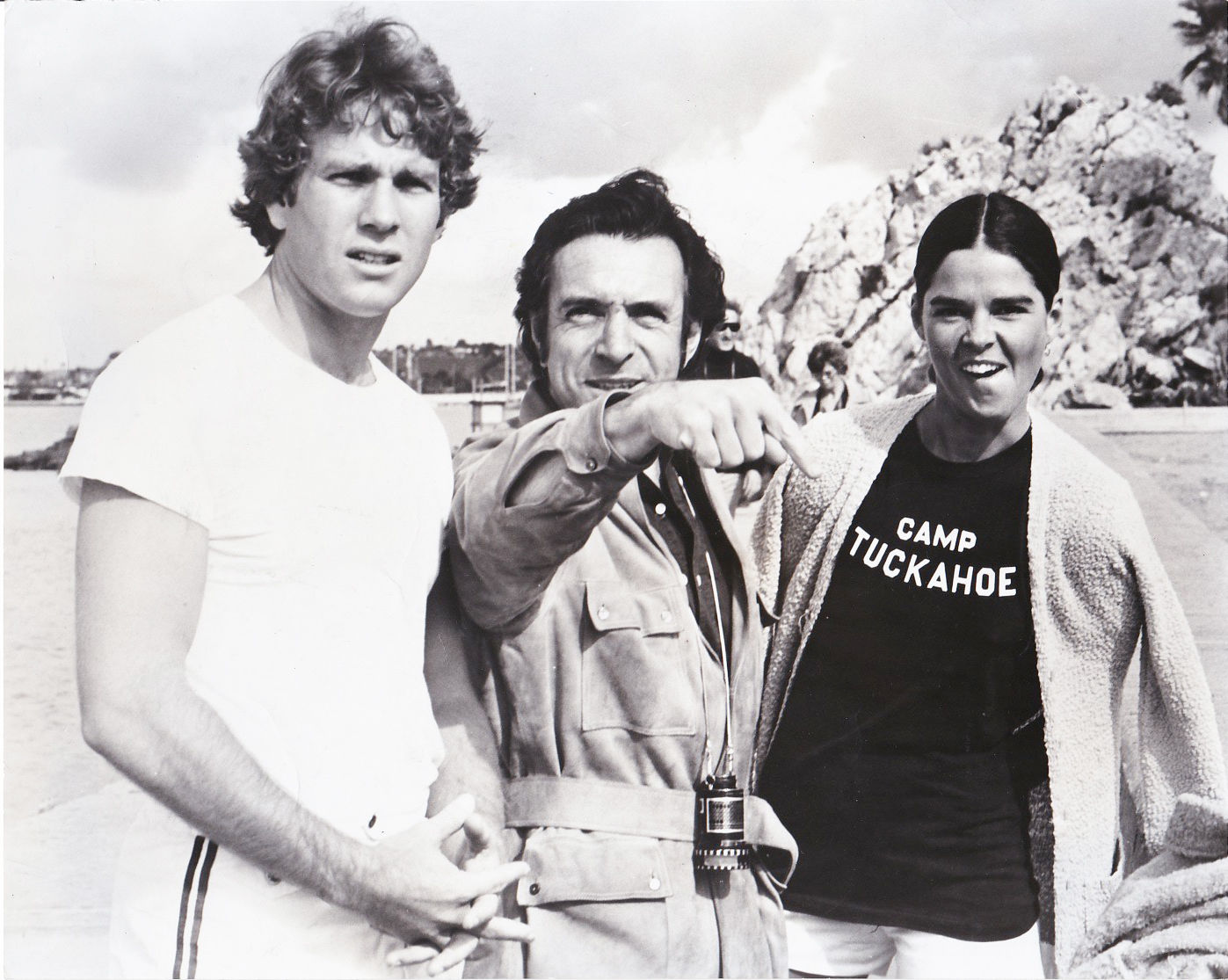 Los Angeles: Paramount Pictures, 1970. Vintage borderless still photograph of Ali MacGraw, Ryan O'Neal, and Arthur Hiller on the set of the 1970 film. With typed identifying description, manuscript annotations regarding layout, and press agency stamps on the verso.