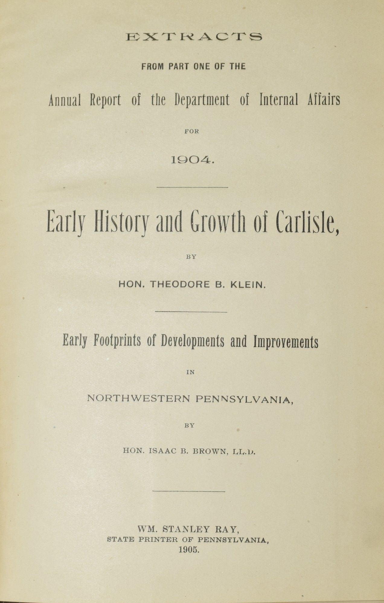 EXTRACTS FROM PART ONE OF THE ANNUAL REPORT OF THE DEPARTMENT OF INTERNAL AFFAIRS FOR 1904. EARLY HISTORY AND GROWTH OF CARLISLE. EARLY FOOTPRINTS OF DEVELOPMENTS AND IMPROVEMENTS IN NORTHWESTERN PENNSYLVANIA