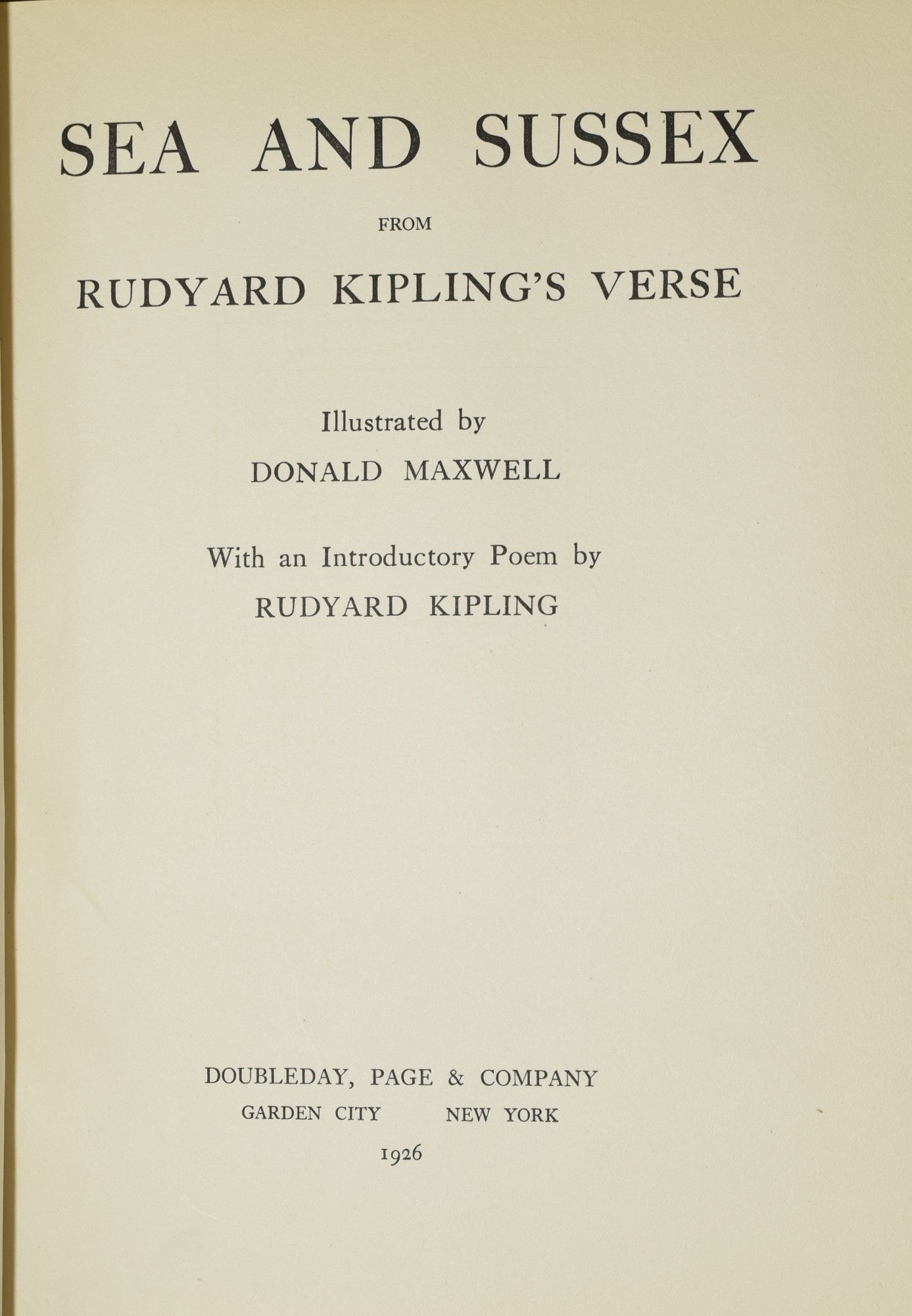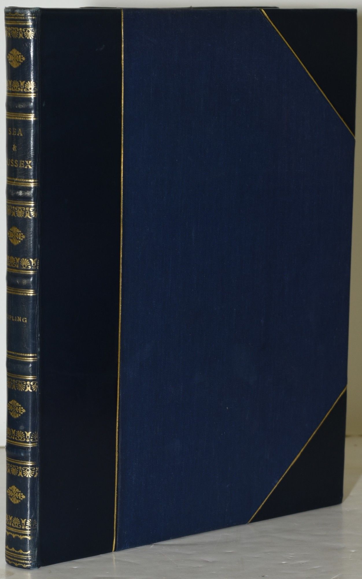 Garden City | New York: Doubleday, Page and Company, 1926. Three Quarters Leather. Very Good binding. The Sea and Sussex, with illustrations by Donald Maxwell, and verses by Rudyard Kipling, complete with 24 plates. Verse and illustration on opposite pages. No marks of any kind. Three quarters polished navy calf over blue cloth; gilt lettering and decoration on the spine. Very Good. Very Good binding.