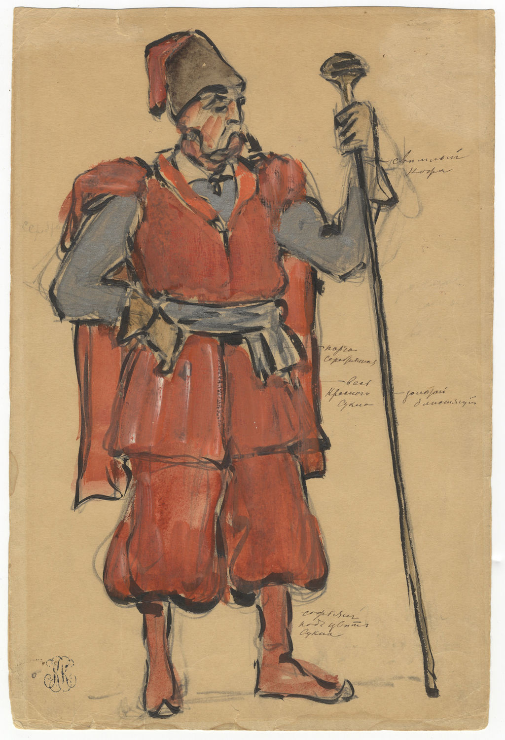 Slightly worn and soiled; some edge tears and repairs; upper right corner with erasure resulting in minor paper loss. Korovine designed costumes for productions of Russian operas including Borodin's Prince Igor, Mussorgsky's Khovanshchina, and Rimsky-Korsakov's Sadko and Le Coq d'Or.