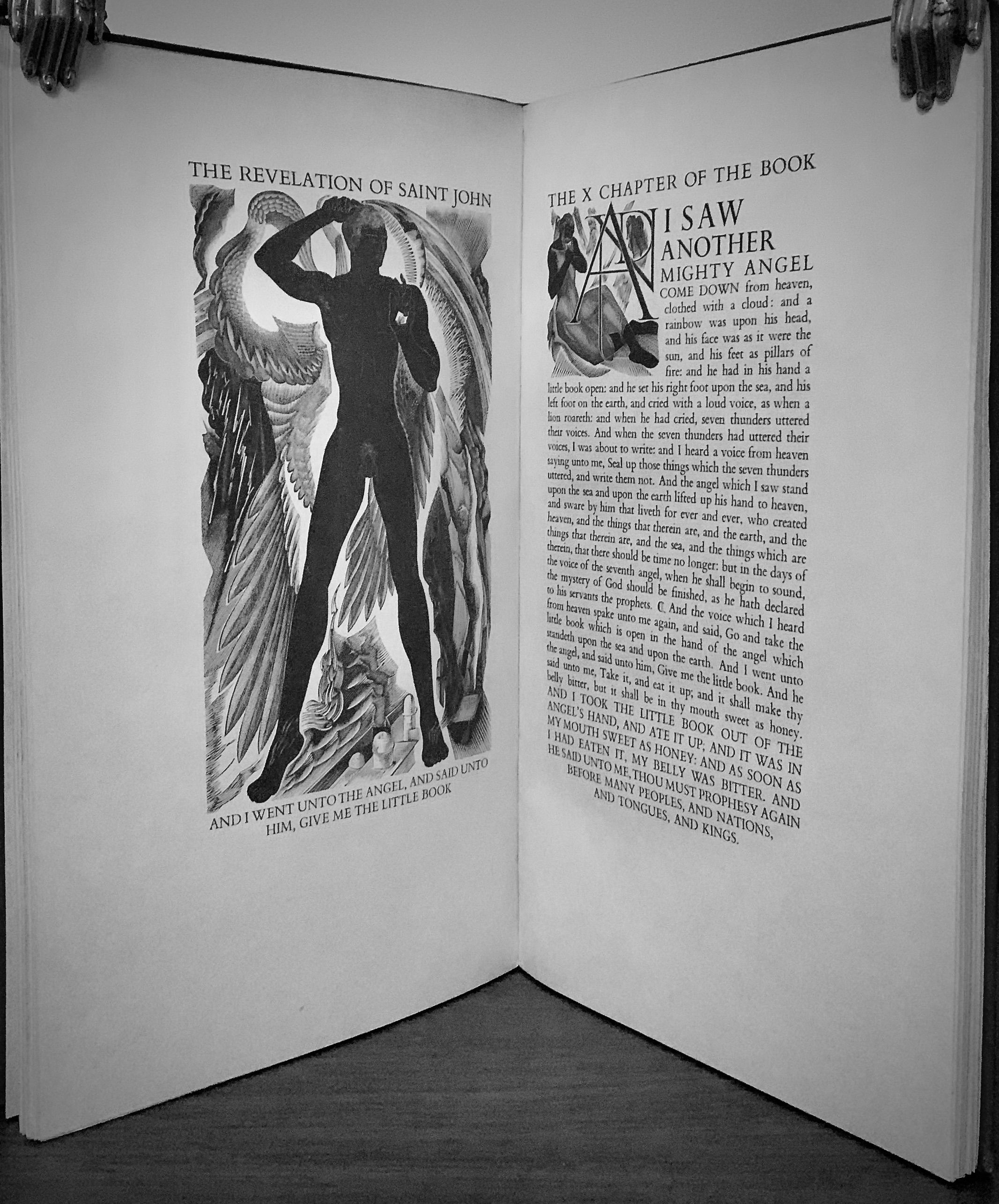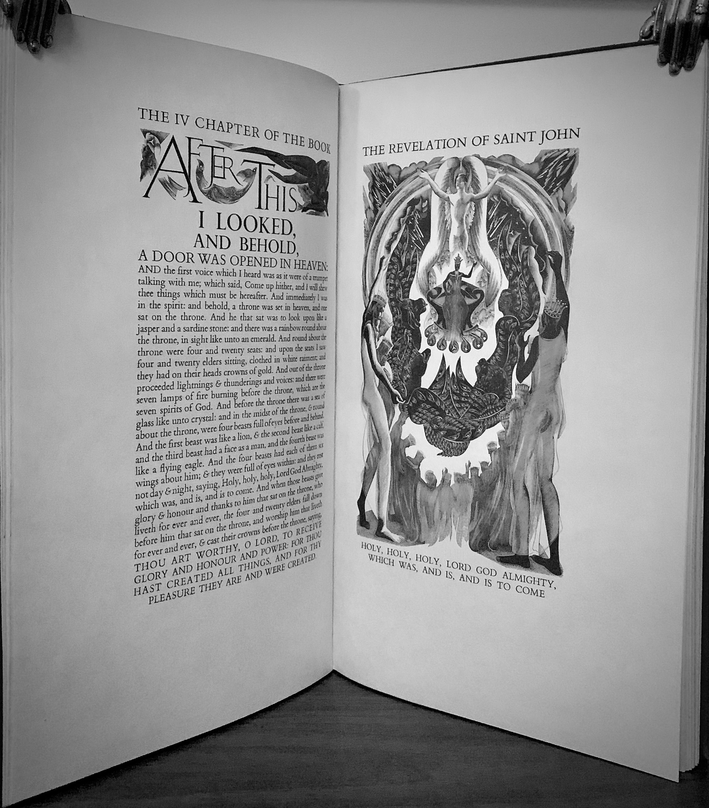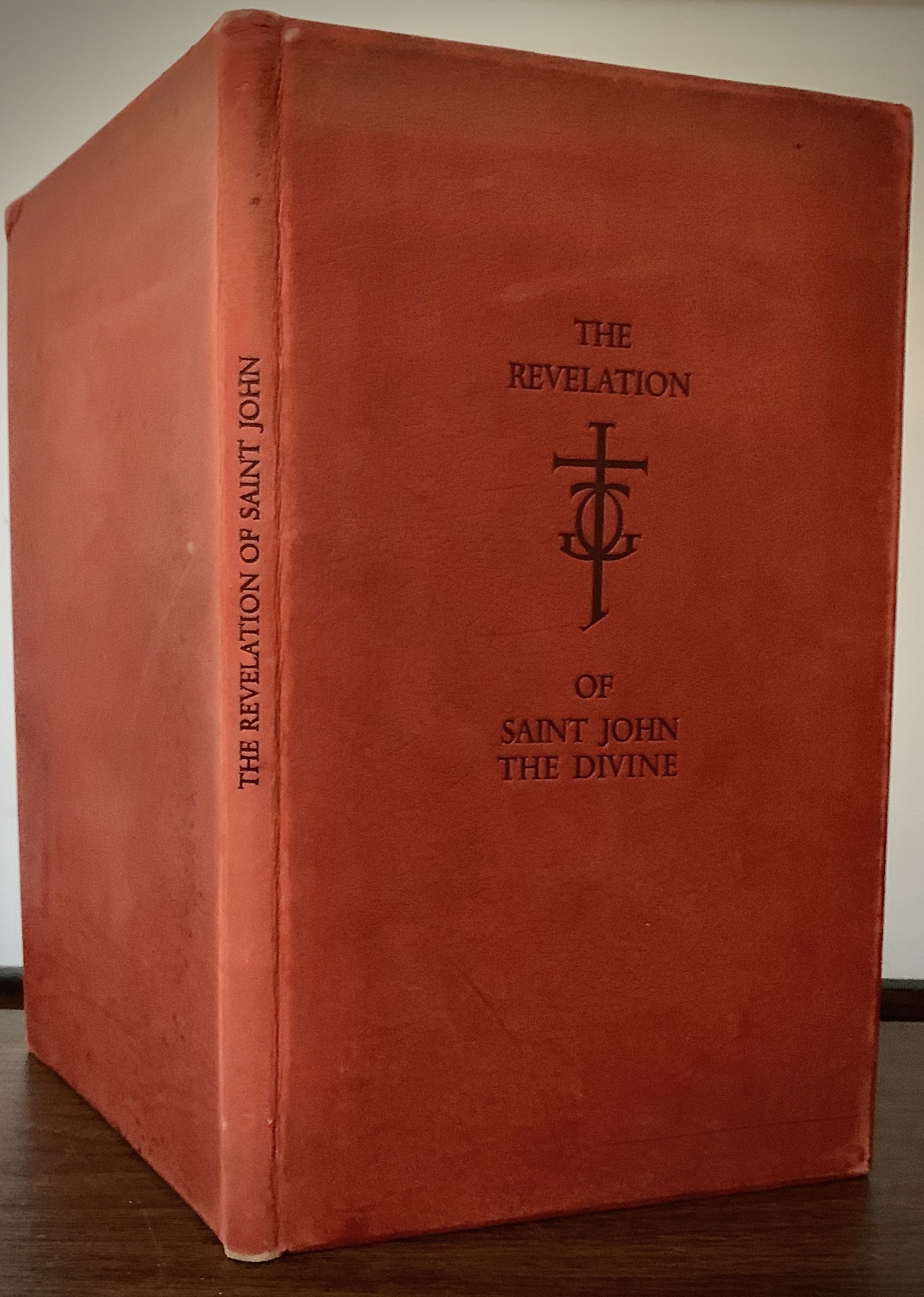 Newtown, Montgomeryshire: Gregynog Press, 1932. leather_bound. Orig. full red calf by the Gregynog Bindery. Very good. Blair Hughes-Stanton. Unpaginated. 35 x 21 cm. Limited edition, copy 26 of 250 with wood engravings and title page designed and engraved by Blair Hughes-Stanton, hand set in Bembo and Perpetua type. More than 40 wood engravings, several are full paged. This edition has been taken from the text of Dr. Scrivener's Paragraph Bible. Roderick Cave, THE PRIVATE PRESS, p. 176 notes, "In the `Revelation` and the `Lamentations of Jeremiah` Hughes-Stanton gave full play to his virtuosity as a wood engraver, and their success was confirmed by Herbert Hodgson's incomparable press work." Interior contents very fresh and bright. One year later Hughes-Stanton left the press. Text printed in red and black, front cover and spine blocked in blind. Slight rubbing to spine head and foot, back cover upper corner bumped.