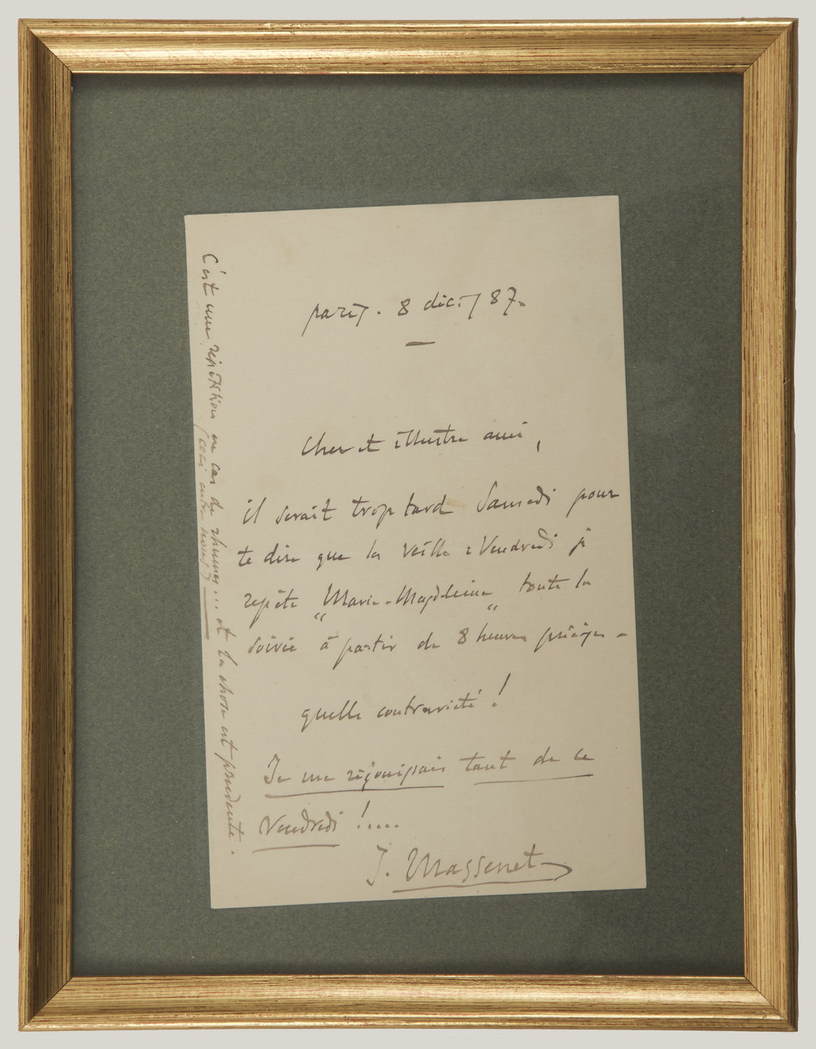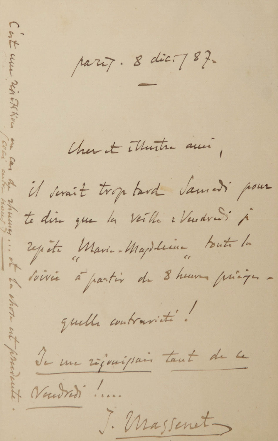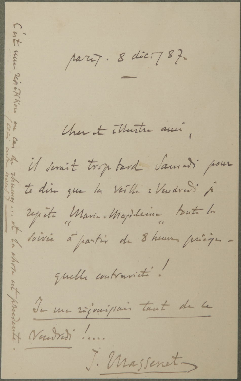 "It would be too late now, the night before, to tell you that on Friday I will be rehearsing "Marie-Magdeleine" all evening from 8 o'clock on, so... how annoying!" Massenet goes on to tell his correspondent that it is a rehearsal "in case of colds... and it's the prudent thing to do," asking him to keep that just between themselves.