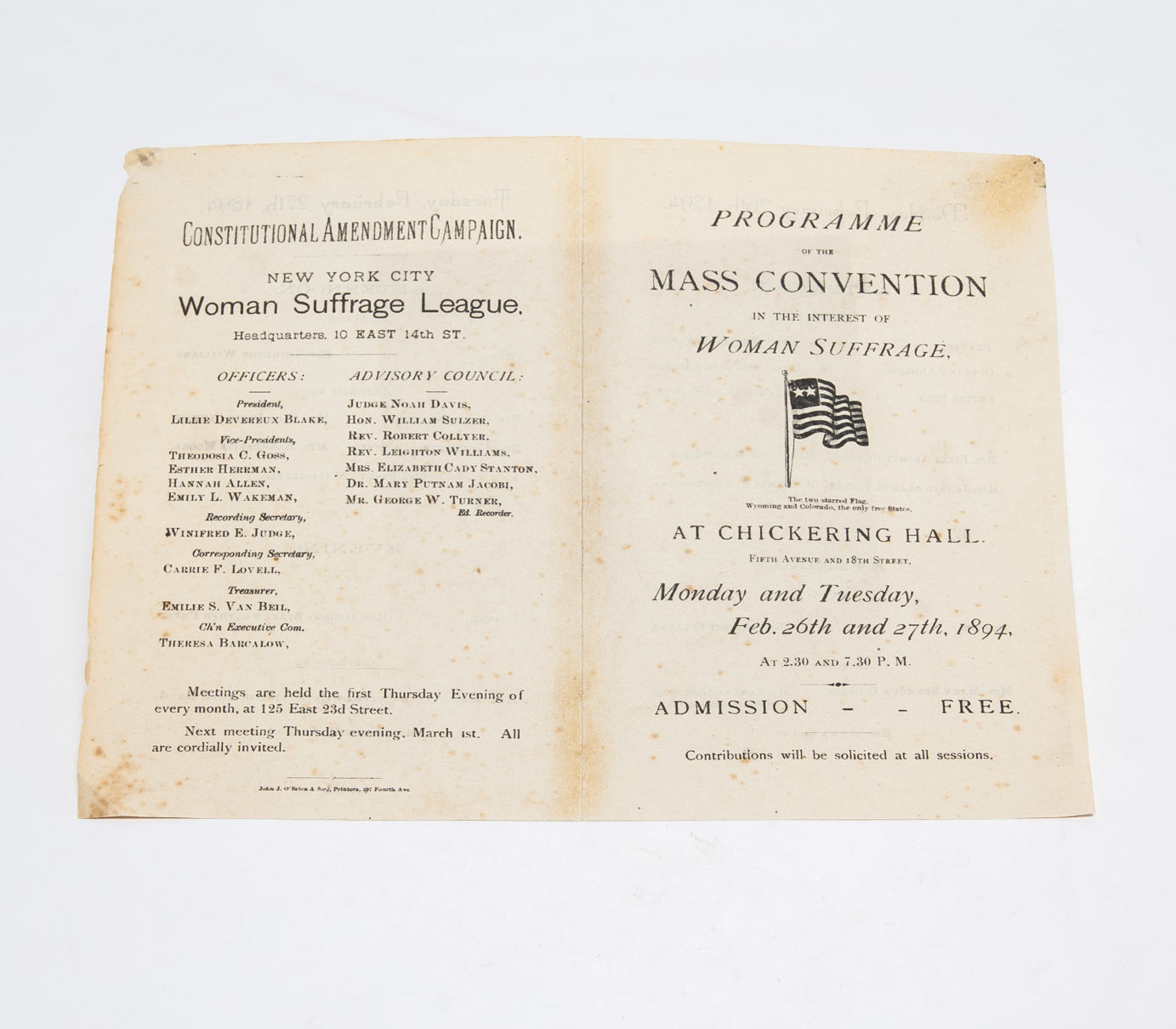 [New York]: John J. O'Brien & Son Printers, 1894. First edition. Near Fine. Original pamphlet promoting the Constitutional Amendment Campaign events hosted by the New York City Woman Suffrage League. 4 pages including self-wraps. Slight chipping to second page, and scattered light foxing at fold and margins. Overall an exceptional copy of this rare pamphlet. OCLC reports no institutionally held copies, and the Programme does not appear in the modern auction record.