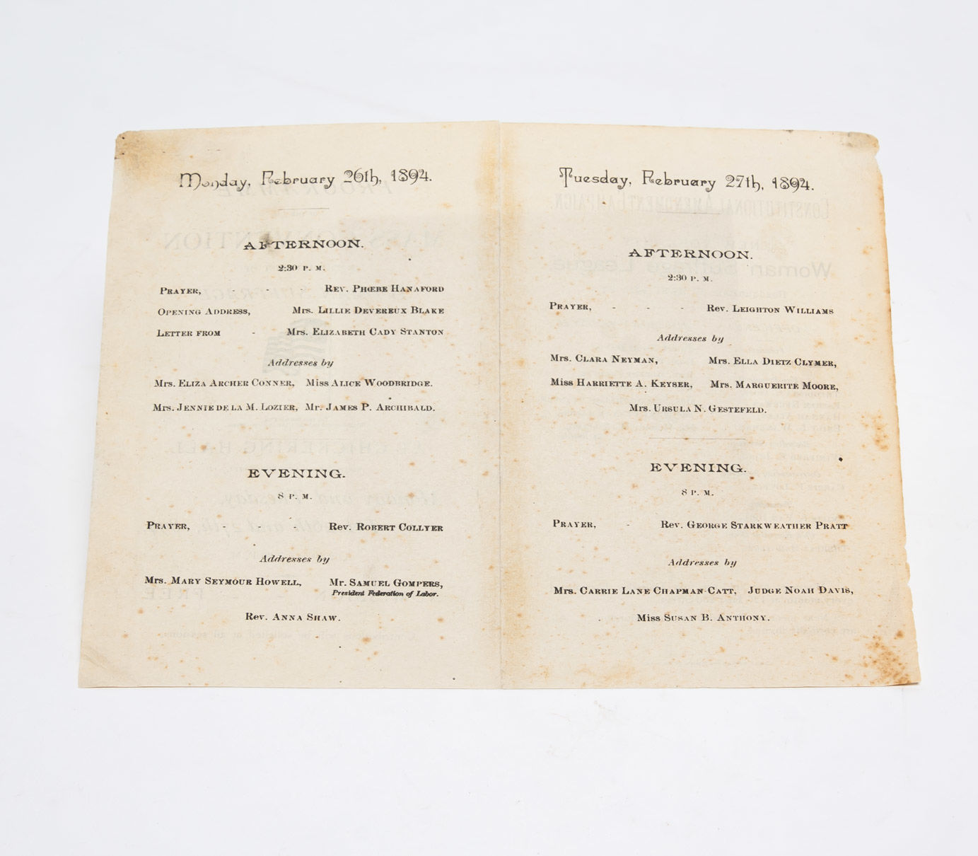 1893-1894 proved to be critical years for the New York suffragists. During that time "New York State held a convention to revise its Constitution...women suffragists had lobbied for a place at this Convention in order to support an amendment that would grant women in New York the right to vote. At the request of suffragists, both Governor Hill and Governor Flower recommended that women be allowed to sit as delegates on the Constitutional Convention. On multiple occasions, prominent New York suffragists such as Susan B. Anthony and Mary Seymour Howell addressed the state legislature to promote the right of women to serve as constitutional delegates. The legislature's final bill reflected the efforts of these suffragists" (Harper-Husted). This program documents the last push for women delegates' presence at the summer Convention. On February 26-27, 1894 the Woman Suffrage League met at Chickering Hall to hear addresses by major leaders. While the Monday events featured a letter by Elizabeth Cady Stanton and talks by Mary Seymour Howell and Rev. Anna Shaw, the Tuesday events were concluded with addresses by Susan B. Anthony and her protege Carrie Chapman Catt. Events such as these helped amass over 332,000 names on petitins and over $10,000 in funds for lobbying. While woman suffragists ultimately won the right to send delegates to the summer convention, their fight was far from over. Ultimately, the committee was divided 98 to 58 against woman suffrage. Susan B. Anthony, aged 74, had spoken in every county of New York state. She would soon pass the mantle to Carrie Chapman Catt, who would continue the fight and accomplish enfranchisement 26 years later.