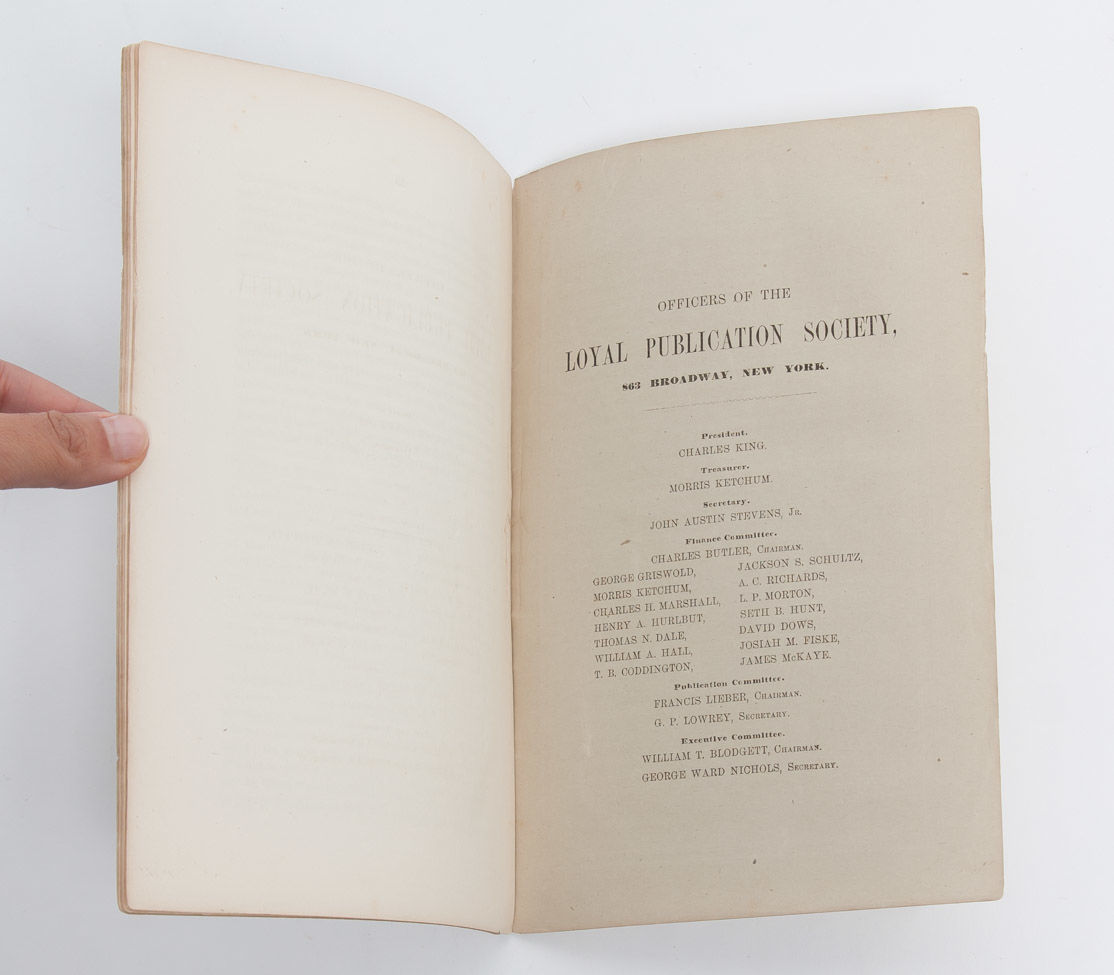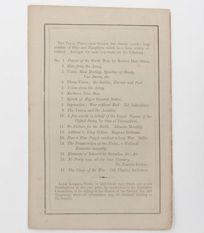 New York: Wm. C. Bryant & Co Printers, 1863. First edition. Very Good +. Original paper wraps. 23 pages. Number 10 in a series of 17 pamphlets addressing the causes and outcomes of the Civil War. One of two variant printings with no priority assigned, this with page 23 beginning "attempt at corrupting." Some separation to the foot of spine, with text block holding well. Soiling and edgewear to front wrap; rusted imprint of paperclip affecting top of pages 13-15. Small blot to text of page 13. Else a solid copy of this important work, which suggests that all women who have survived the Civil War deserve credit for their strength and sacrifice.