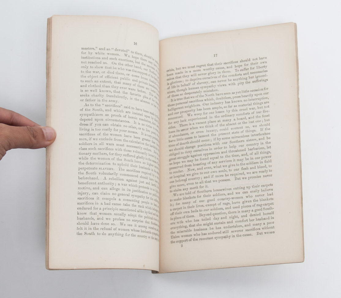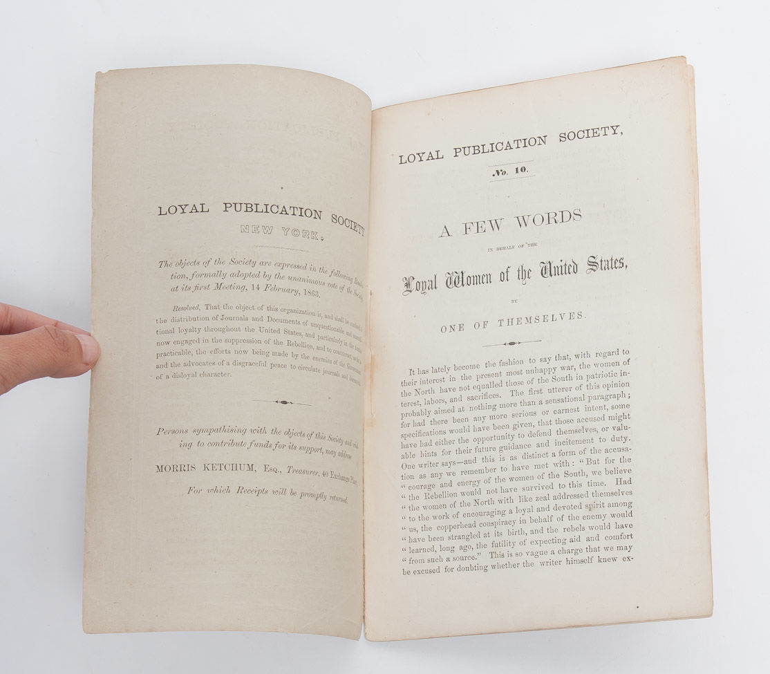 While at its release, A Few Words was anonymous, an 1865 publication by the Loyal Publication Society attributes the work to Caroline Kirkland (Mrs. C. M. Kirkland). Kirkland, a writer, educator, and abolitionist, brought a unique perspective to the debate on women's roles in the Civil War. A Northerner by birth, she spent the years leading up to the war living with her husband on a homestead in Michigan. Her experience living in the North and West, and traversing the South, informs her response to the accusation being made by men on both sides: that the strength of Southern women and the apathy of Northern women had contributed to seccession and the duration of the conflict. According to Kirkland's argument, women on both sides nursed sick soldiers, rationed, and experienced the losses of husbands, brothers, and fathers. Yet Kirkland argues that women of the South are implicated in the evils of slavery. "They, having seen slavery, felt it, known its horrors, suffered under its attendant evils and learned...its incompatibility with God's benign law of love have deliberately lent themselves...to the perpetuation of so awful an evil." As an abolitionist and a women's rights activist, Kirkland highlights the cognitive dissonance involved in promoting the strength of women who refuse to recognize that their fight for equality is tied to that of all oppressed Americans. She concludes with hope from the West, where she comments that strong-minded women have rejected courtships and shunned deserters who refuse to stand their ground. A rare and interesting work documenting a Union woman's perspective on American women's responsibilities in wartime.