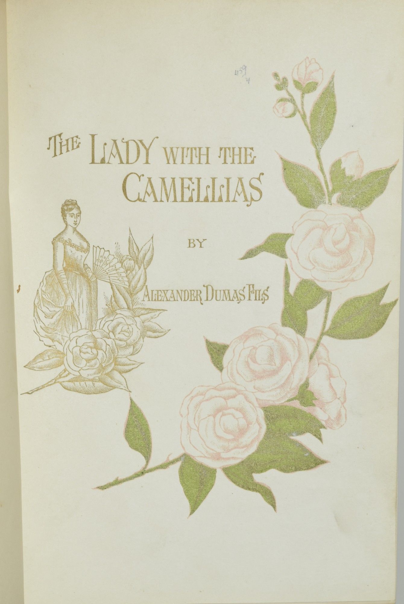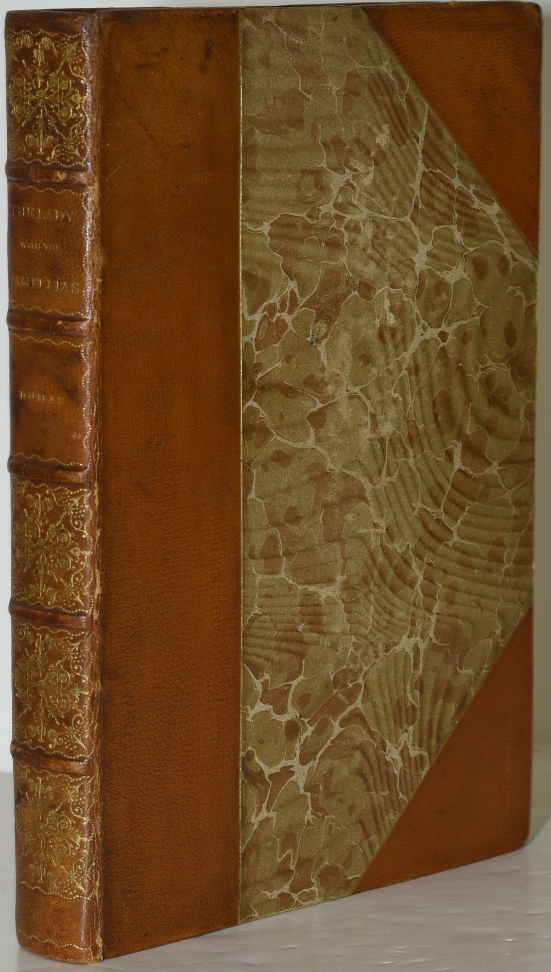 Philadelphia: Gebbie & Co, 1889. Three Quarters Leather. Near Fine binding. Alexandre Dumas Fils' The Lady with the Camellias, translated into English, with illustrations by Albert Lynch. Collates complete, with ten engraved plates. Half title; title page vignette; additional title page, chromolithographic. Bookplate. Three quarters tan morocco over marbled paper boards, with lettering and decoration in gilt. Top edge gilt. Near Fine binding.