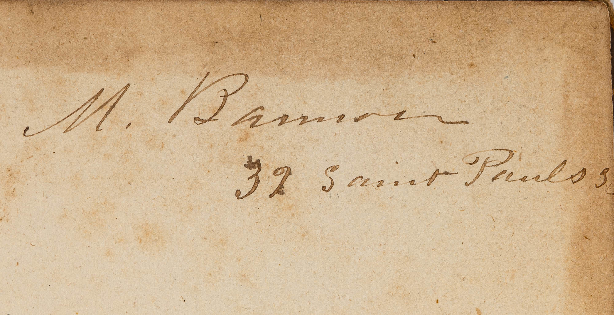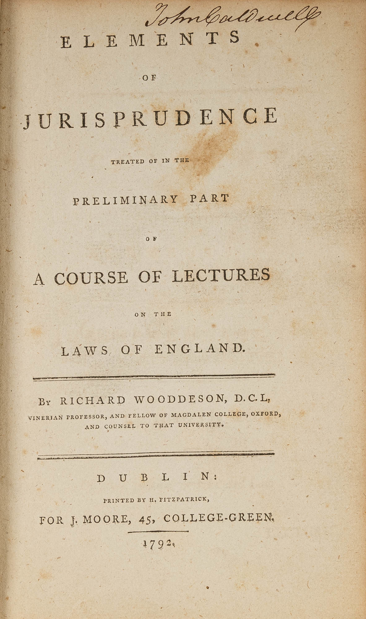 1792. Dublin, 1792. Dublin issue of only edition. Dublin, 1792. Dublin issue of only edition. "The Complement of Sir W. Blackstone's Commentaries" Wooddeson, Richard [1745-1822]. Elements of Jurisprudence, Treated of in the Preliminary Part of a Course of Lectures on the Laws of England. Dublin: Printed by H. Fitzpatrick for J. Moore, 1792. [vi], 207 pp. Octavo (8" x 5"). Contemporary calf, lettering piece and blind fillets to spine, blind tooling to board edges. Light rubbing and a few shallow scuffs and small stains to boards, which are very slightly bowed, moderate rubbing to extremities with some wear to spine ends and corners, joints cracked, rear hinge starting. Moderate toning, occasional light foxing, two small early owner stamps (of William Schley and John Caldwell) to front board, later owner signature (M. Bannon, 32 St. Paul) to front pastedown and free endpaper, another early signature (John Caldwell) to head of title page. $850. * Dublin issue of the only edition, London 1783. Wooddeson was elected a Vinerian Scholar in 1766, became a Vinerian Fellow in 1776 and was Vinerian Professor from 1777 to 1793. He was steeped in Blackstone's work, and he strove to supplement it. According to Marvin, "Dr. Wooddeson's Lectures form, in a measure, the complement of Sir W. Blackstone's Commentaries, for he supplies some deficiencies in the production of his predecessor, and treats more in detail, some topics, but slightly noticed by him. Though of acknowledged merit, as to learning, method of arrangement, and accuracy of rules, they do not seem to have attained so great a reputation as their real worth entitles them to. In point of style, and beauty of narration, they follow the Commentaries, haud non passibus aequis." One of the owners of this copy was likely Michael Bannon [b.1827], who emigrated to Baltimore, Maryland from Ireland at the age of 18, attained a college education and opened a legal practice in Baltimore, where he became an eminent local figure. (The William Schley is likely not the Schley who served as governor of Georgia.) Marvin, Legal Bibliography 745 (citing the London 1783 edition). English Short-Title Catalogue N1371.