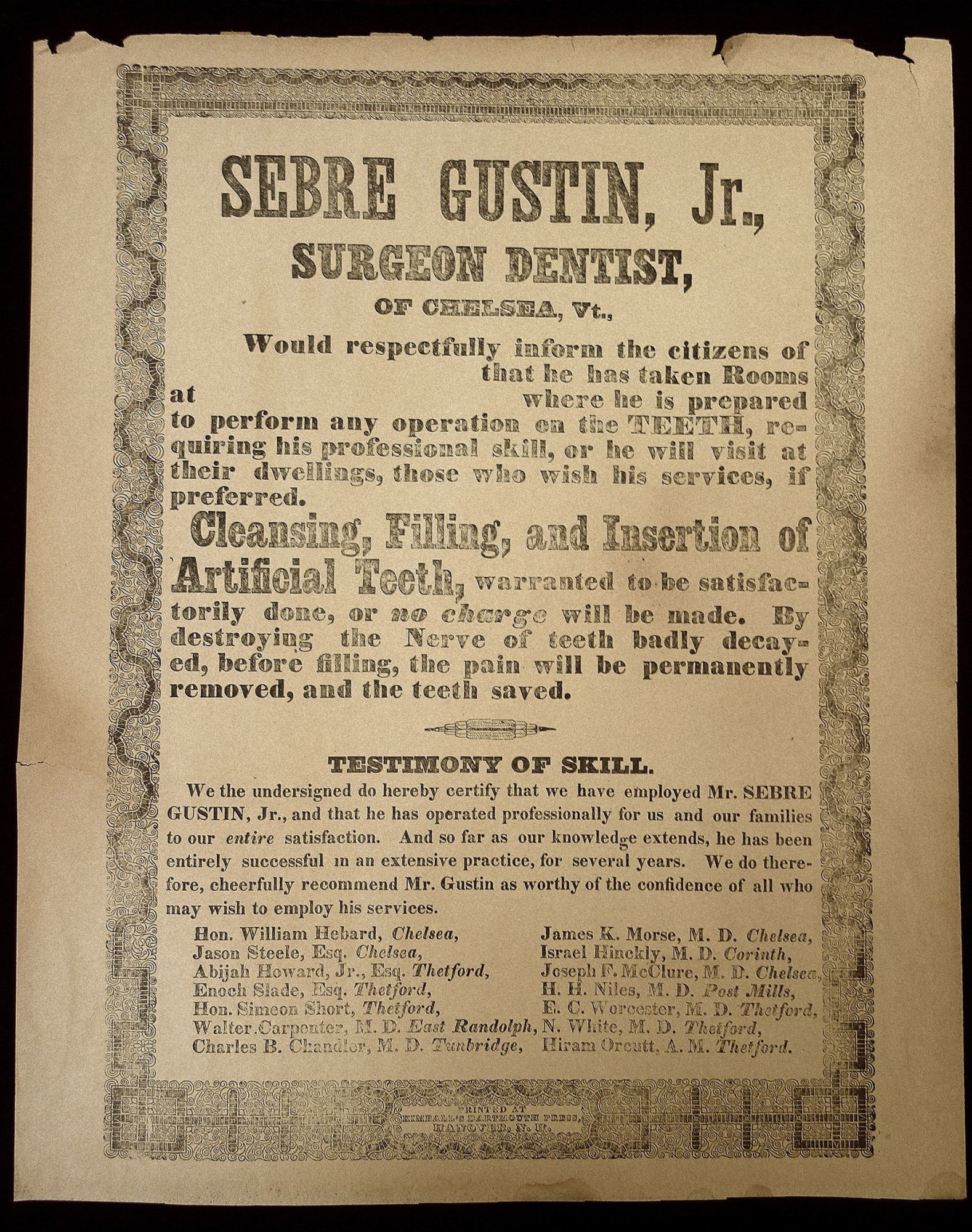 Hangover, NH: Kimball's Dartmouth Press, 1845. Edge wear. Few margin chips.. A 15" x 12" boardside printed on orange stock bordered in decoratiave elements. Sebre Gustin, Jr. of Chelsea, Vt. wished to advertise that he had recently opened rooms and was willing to provide home visits for interested patients. There are two blank spaces where the town name would be and the specific location of his business would be filled in. He offers, cleansing, fillings, and artificial teeth. There is a "Testimony of Skill" with fourteen names following the statement that they have employed and recommend him. 15" x 12