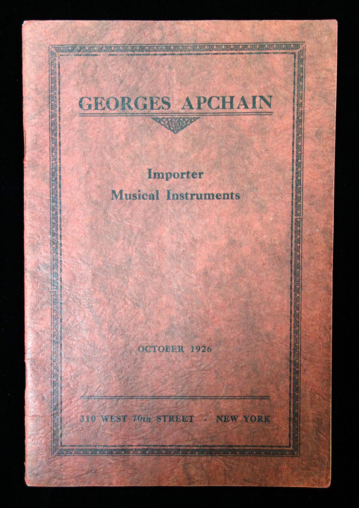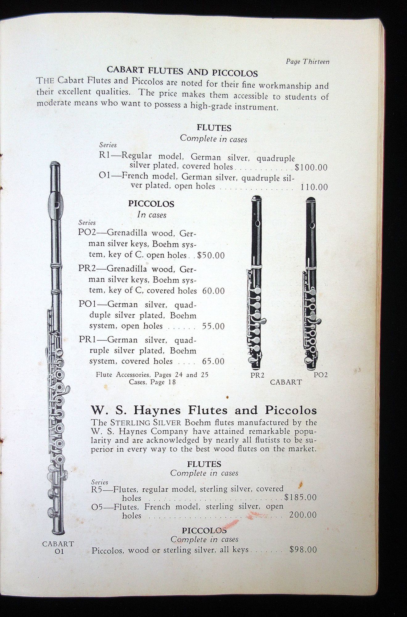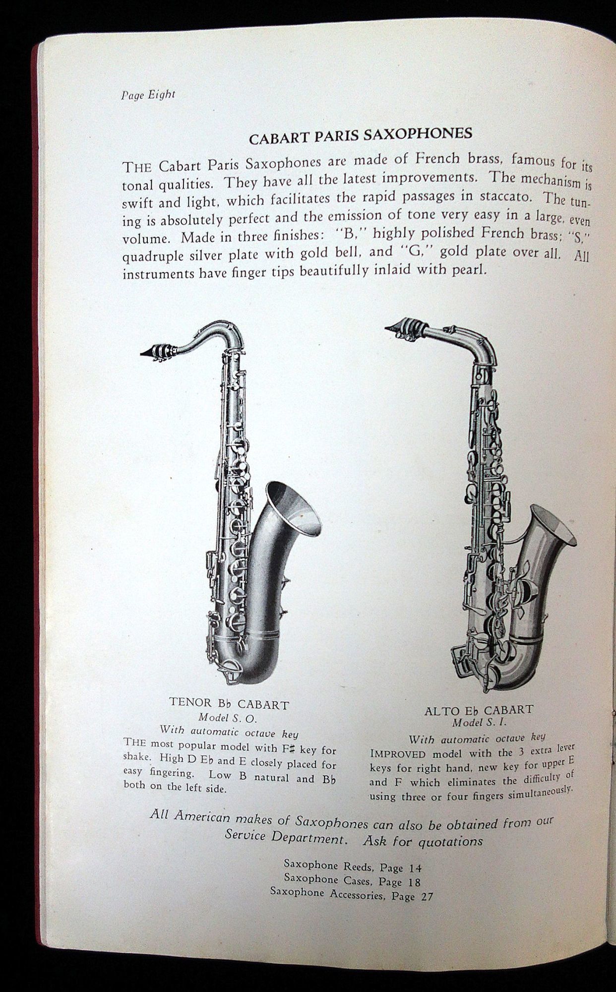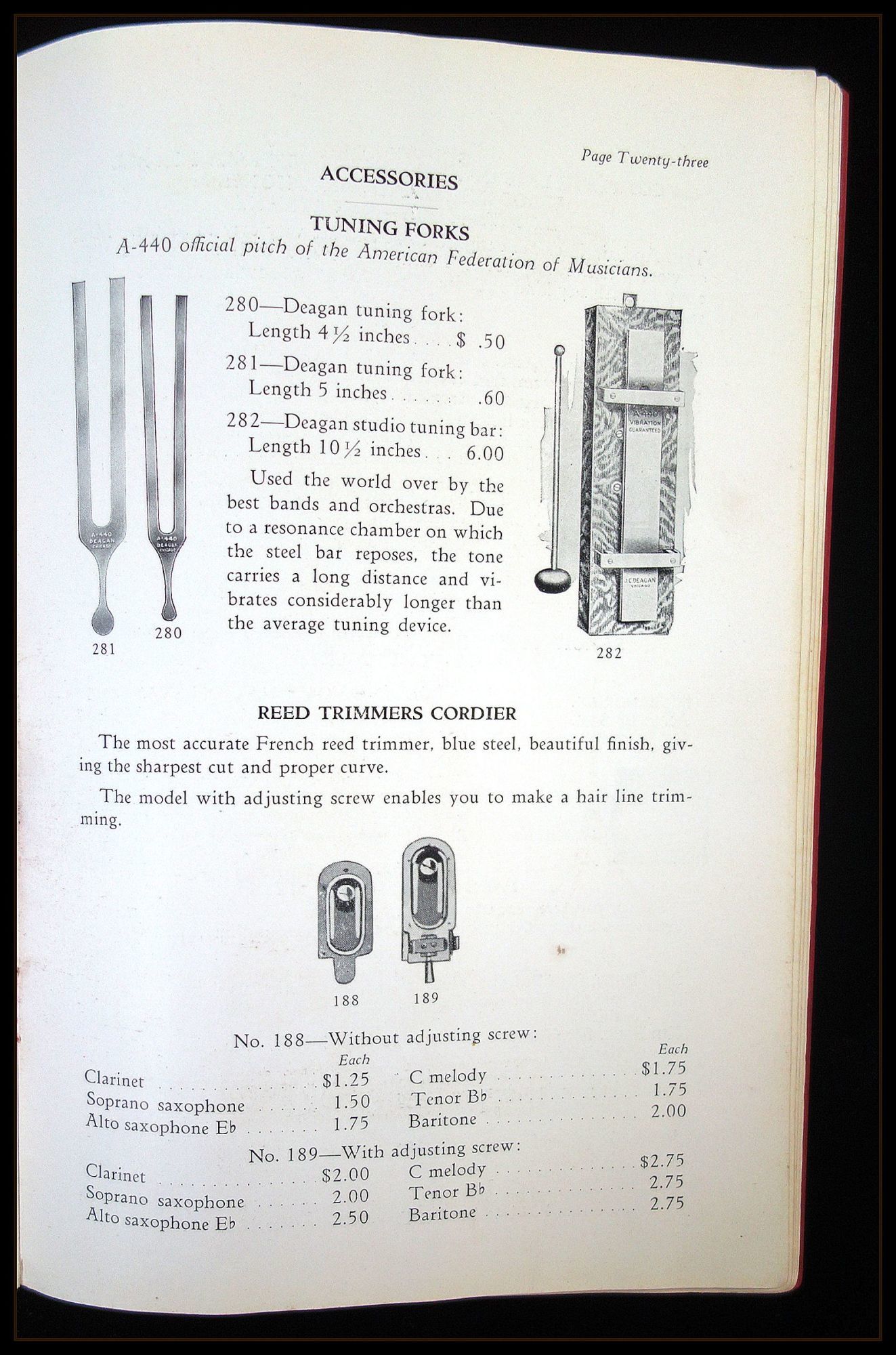 New York: Frederick W. Binzen & Company, Oct-26. Some small marks in pages.. The catalogue offers not only the sale of instruments, but the accessories and necessities in order to care for a variety of types. There is brief instructions for care of woodwind instruments. Following is a wide variety of woodwinds, from different types of Cabart oboes, to piccolos, to English horns. Short narrative descriptions with the various styles are offered, along with their price. Then there are accessories for almost all instrument types, from mouthpieces, to violin cases, to music stands, and tuning forks. There are illustrations of some of the products throughout to give a visual idea of the items being sold. 9 1/4" x 6