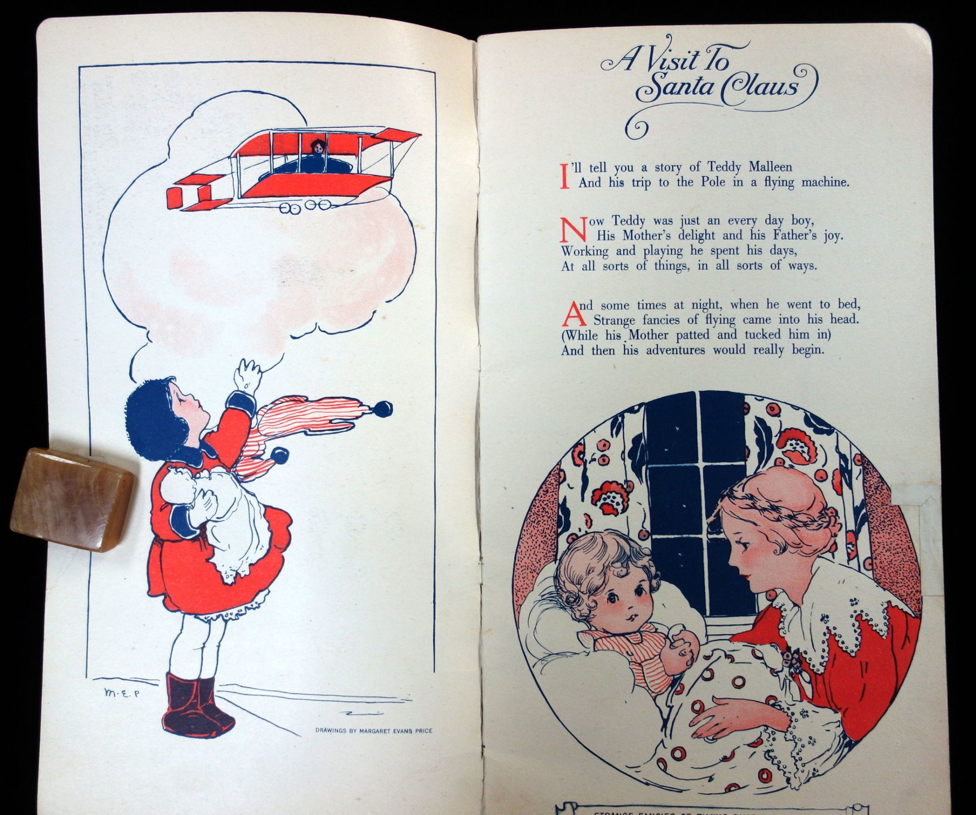 Rochester, NY: Stecher Litho. Co, 1919. Signs of wear on spine, 1" repaired tear to front cover and 3/4" tear to first leaf, both patched with white tape. 1/2" tear on top edge of page 7. 8 pp unnumbered. Litho on tan, heavy stock wrap. Illustrations throughout by Margaret Evans Price. Part three color, part full color. 7" x 13 3/4". OCLC- 0 (Oct, 2018).