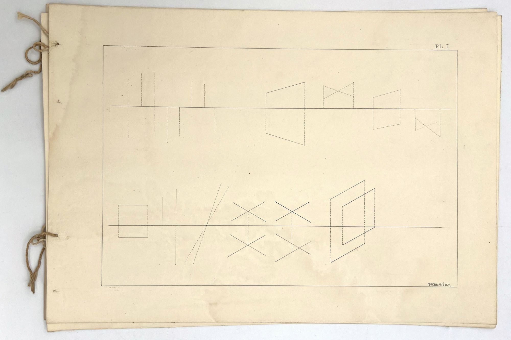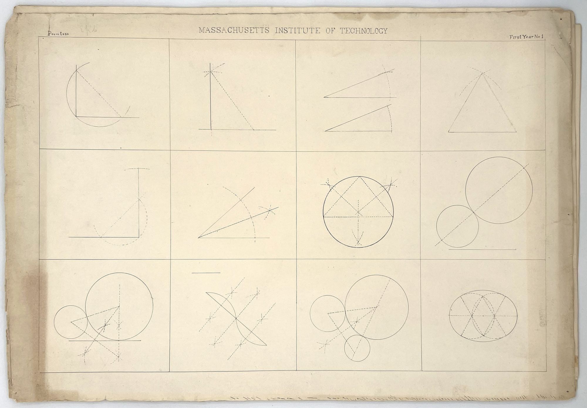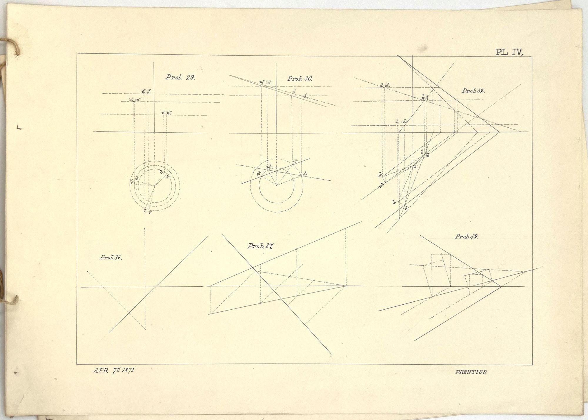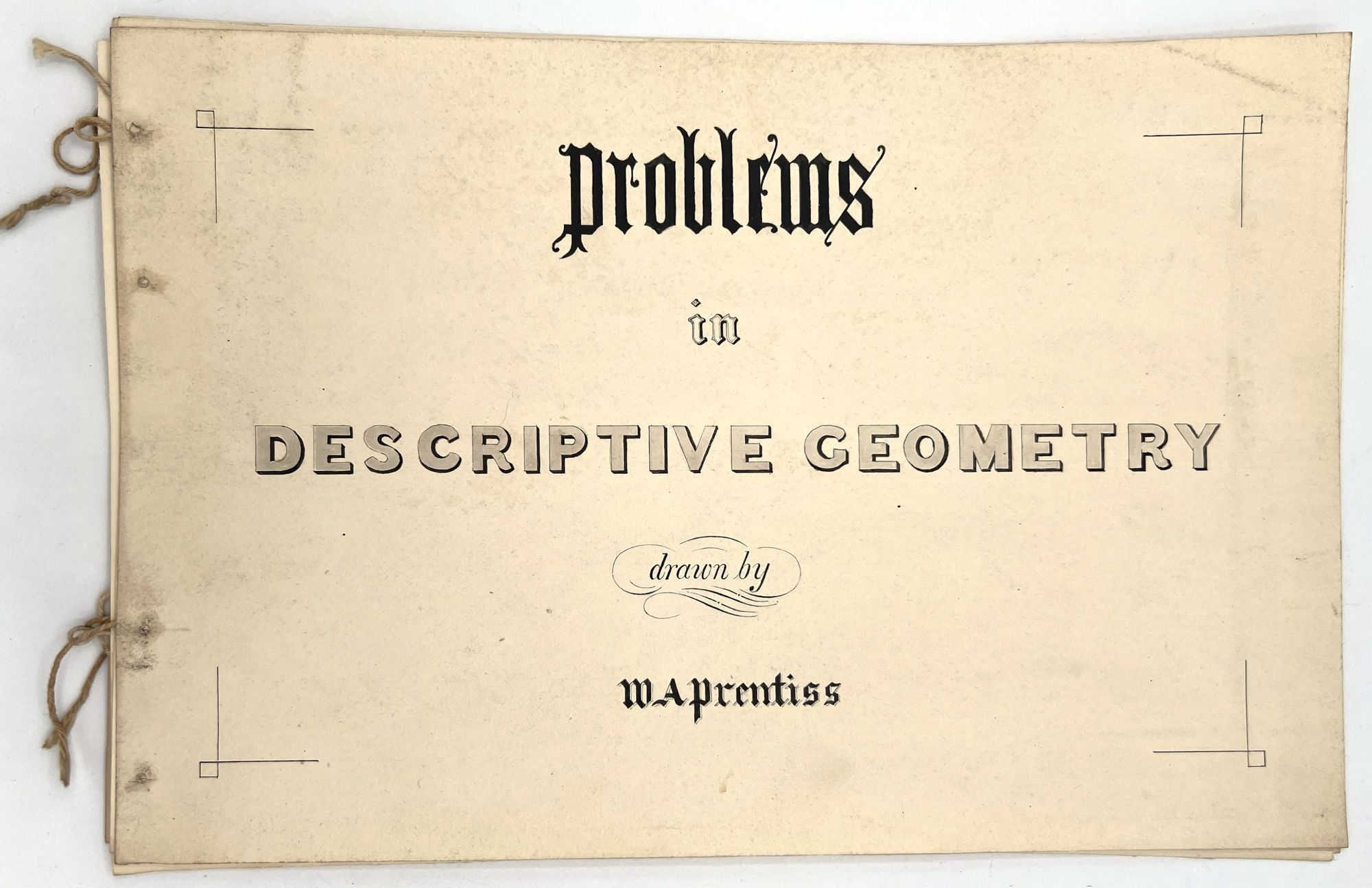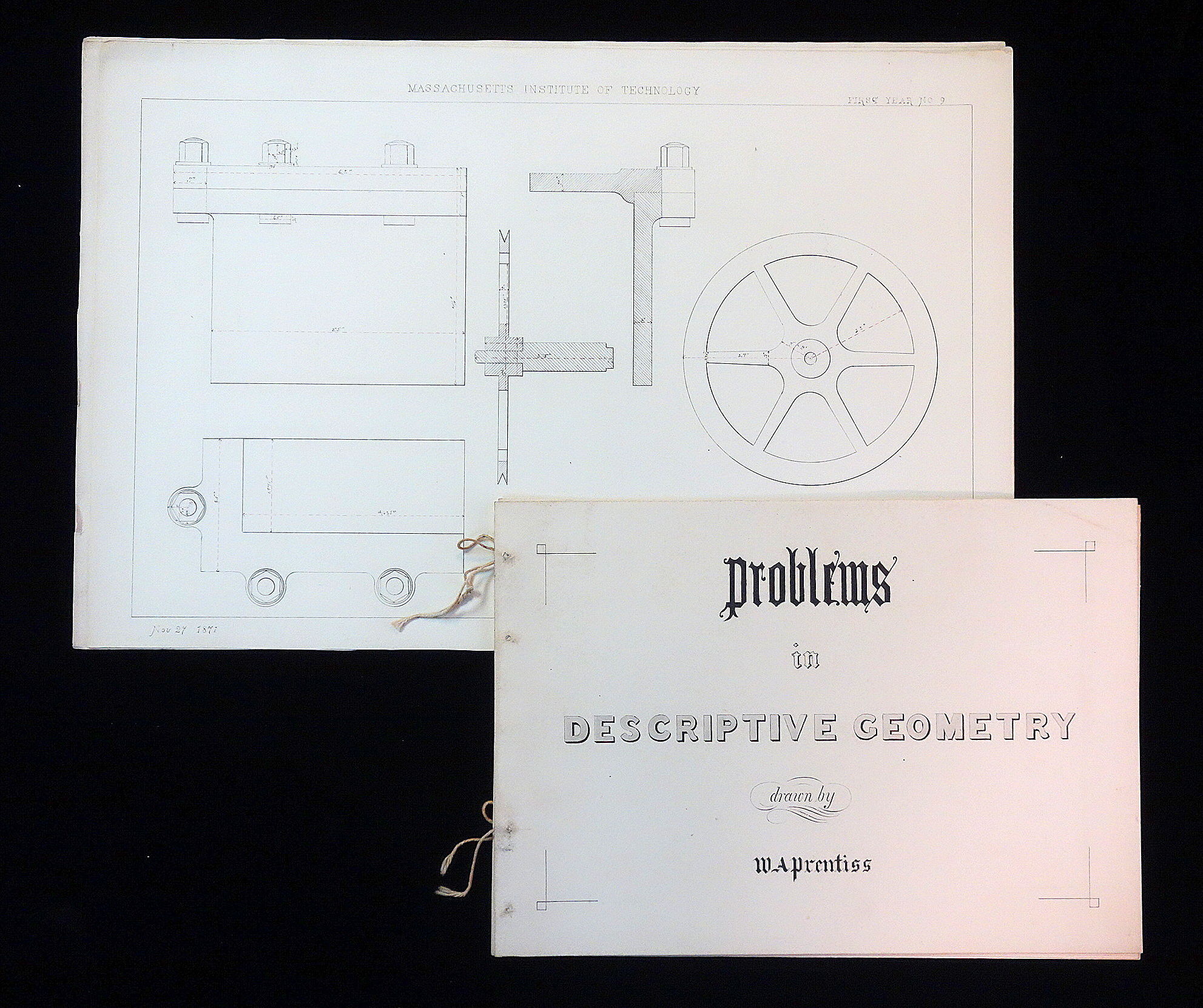 1872. Sewing defective.. Two (2) sets of manuscript student exercises created by a First Year MIT student. The first is titles Problems in Descriptive Geometry drawn by W. A. Prentiss with five (5) plates and 50 problems. Measures 9 1/2" x 13 1/2". The second is 12 of 13 plates (No. 7 lacking) with an array of drawings including Rivets drawn full size, Angle and T iron, Eccentric, drawings from models and Problems from Projections. Measures 13 1/2" x 20