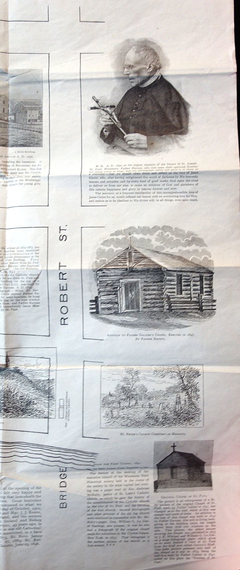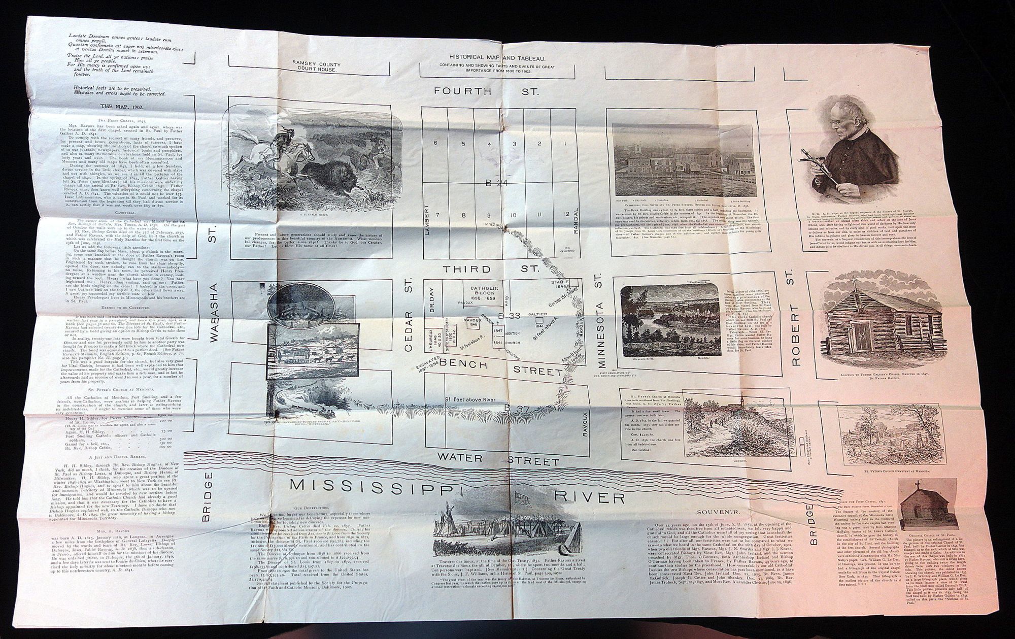 St. Paul Minnesota, 1903. Letter folds. A 21 3/4" x 33" illustrated historical map and tableau. It includes a street map of Water Street through fourth St. and Wabasha through Robert St. Information on the First Chapel 1841, the Cathedral, St. Peter's Church at Mendota, Mgr. A. Ravouz, Our Benefactors and much more. Includes both illustrations and images from photogrpahs of relevant loactions and sites. Revers is blank.