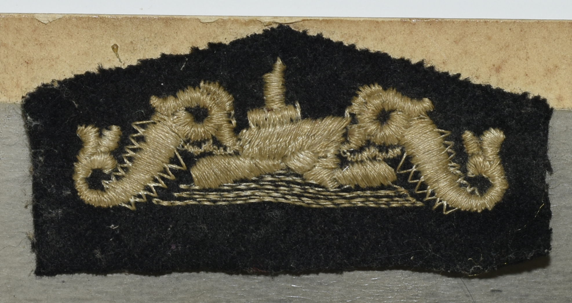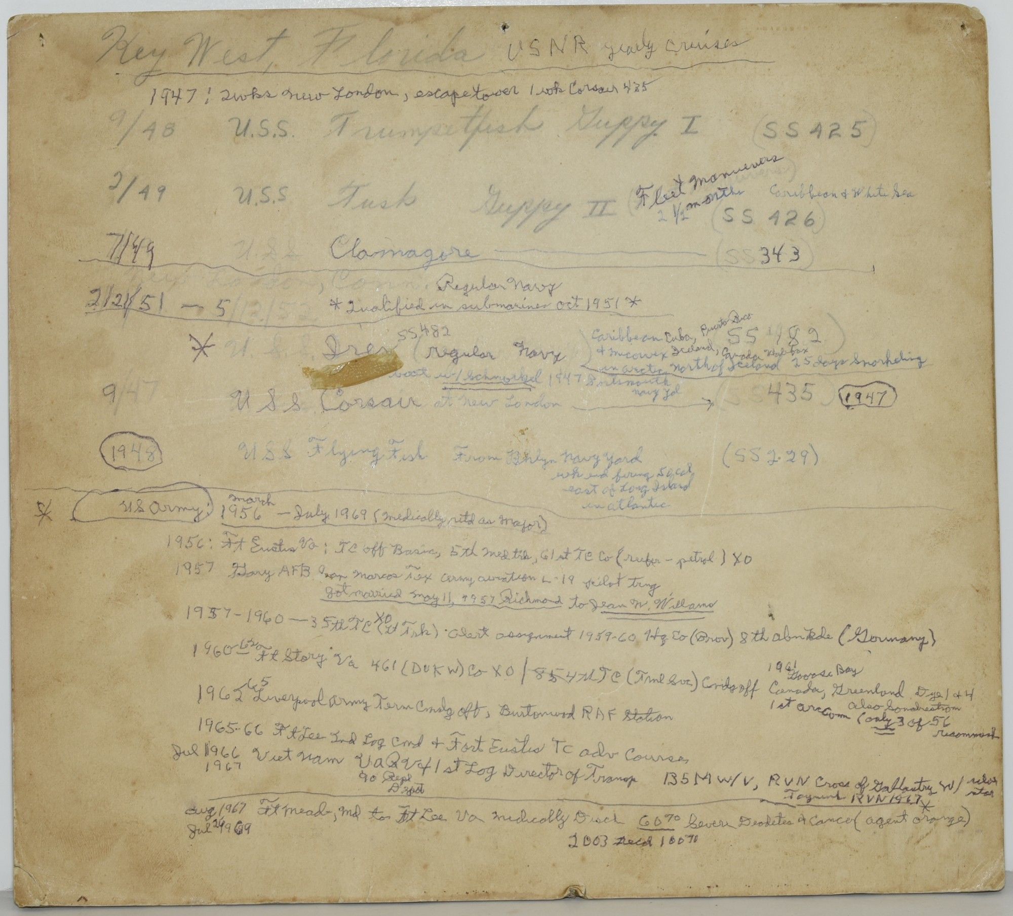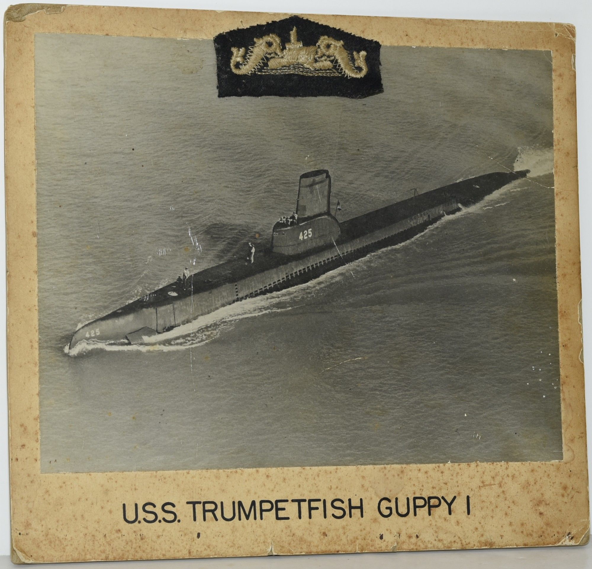 A mounted photograph (7 1/2" x 9 1/2"; on 9 1/2" x 10 1/2" captioned mount), along with a patch for the Trumpetfish attached at the top of the mount. The USS Trumpetish, a Balao class submarine was launched in May 1945 and in 1947 underwent a GUPPY (Greater Underwater Propulsive Power) conversion -- increasing her maximum submerged speed as well as offensive capabilities [cf. Trumpetfish SS-425; Dictionary of American Naval Fighting Ships; Navy Department, Naval History and Heritage Command]. On the back of the mount, in pencil and in pen, is what amounts to a service record beginning with USNR yearly cruises. Sept. 1948 at the USS Trumpetfish Guppy I (SS425).