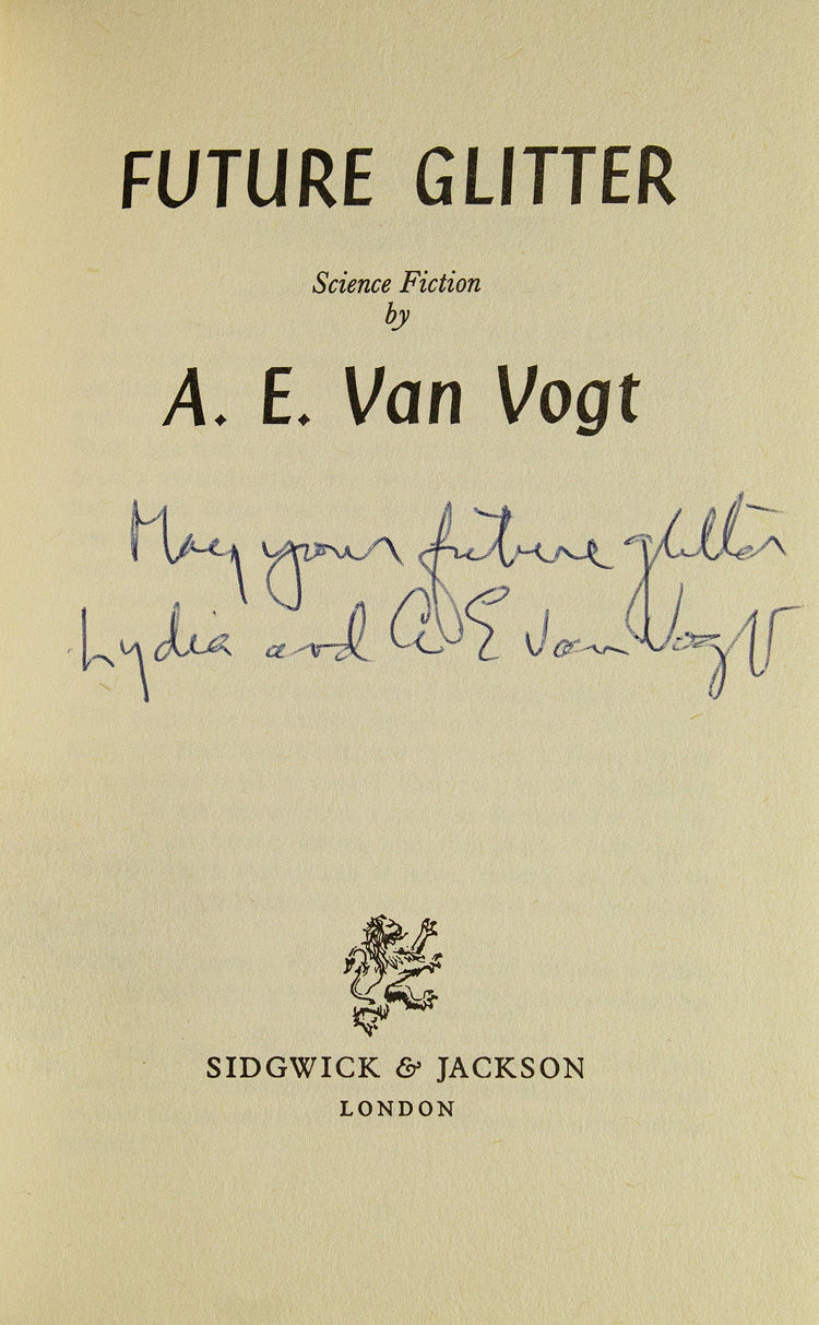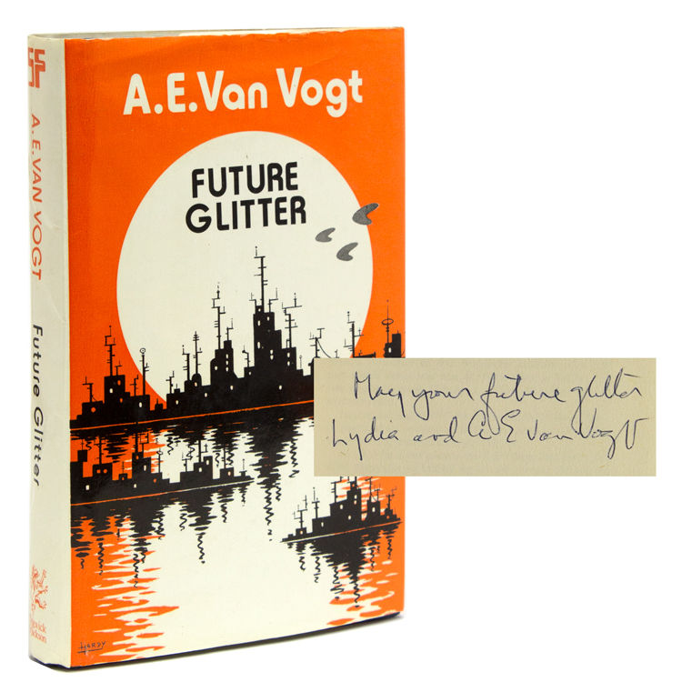 London: Sidgwick and Jackson, 1976. First British edition and first hardcover edition. 8vo. Blue boards. Fine in fine dust jacket. First British edition and first hardcover edition. 8vo. Inscribed on the title page by the author, “May your future glitter, Lydia and A E Van Vogt”. Currey p. 492