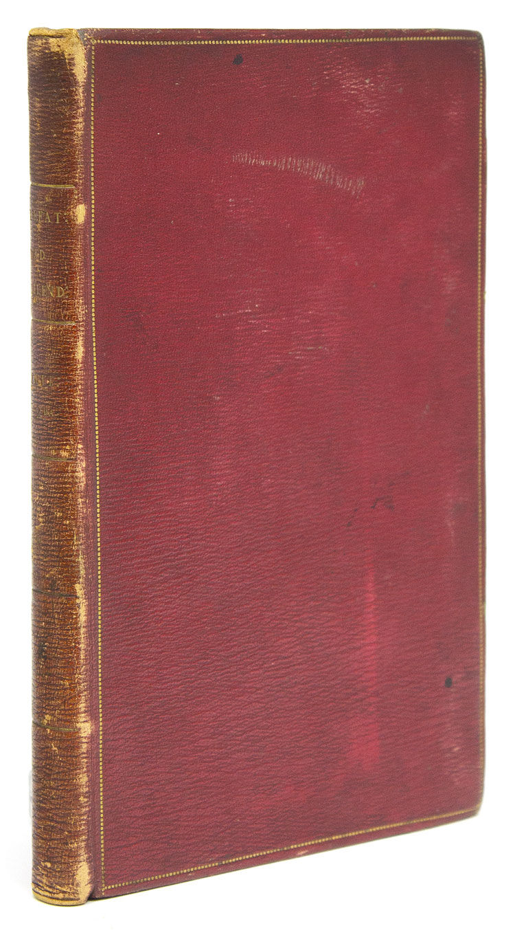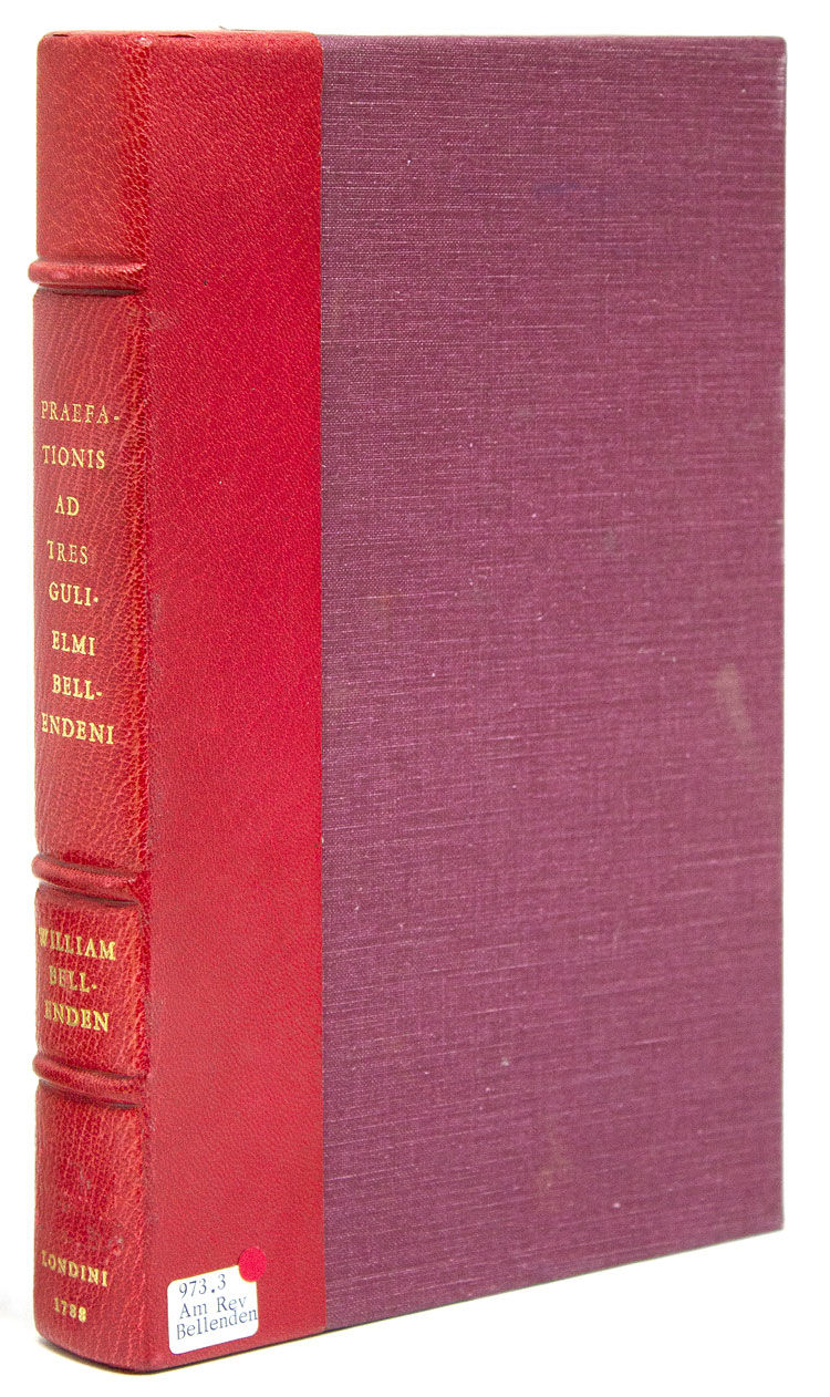 London: W. Browne & J. Warren, 1788. Second edition. Three portraits with explanatory text leaves. [2], viii, cxxxvii pp. 1 vols. 8vo. Contemporary red morocco, gilt. Spine faded, extremities lightly rubbed. Bookplate on front pastedown. Light scattered foxing. Some contemporary annotations. Very good. In a half morocco and cloth slipcase, spine gilt. Second edition. Three portraits with explanatory text leaves. [2], viii, cxxxvii pp. 1 vols. 8vo. Second edition of William Bellenden's work on classical political thought, first published in 1615. The original edition praised Cicero, Pliny, and Seneca, while they have been replaced by the editor here with three Englishman. "This work was much admired and much plagiarized in the eighteenth century. Samuel Parr, for instance, issued a new edition of Bellenden in 1787 [sic], and supplied three English luminaries (Burke, Fox, and Lord North) in place of Bellenden's Romans" - DNB. A very nice copy in red morocco. ESTC T108215