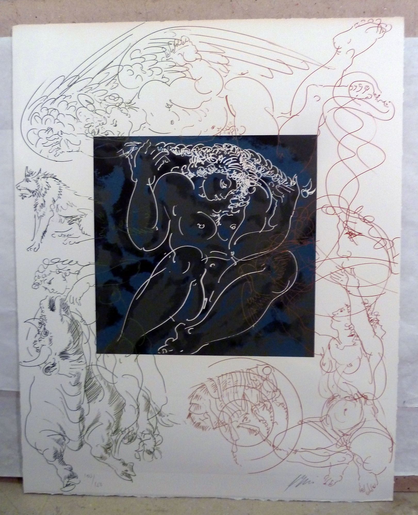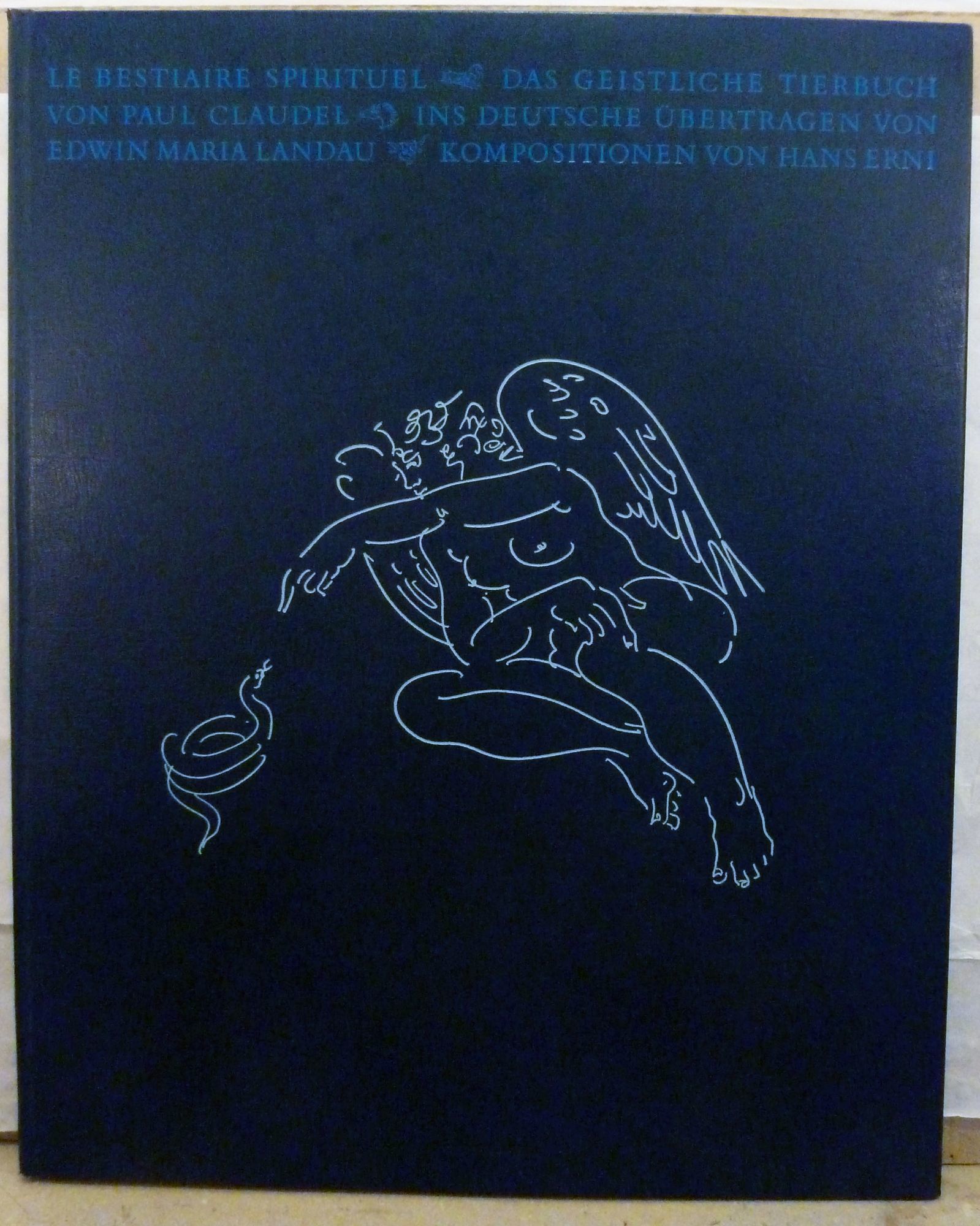 Zurich: Drucke von Josef Stocker, 1984. leather_bound. Orig. full navy morocco lettered in lighter blue, front cover illustration blocked in white, Near fine. Erni, Hans. 56 pages. Folio, 51 x 41 cm. Limited edition, copy 103 of 150 with four original prints each signed by Erni housed in a rear pocket. Text in French and German with numerous black and white lithograph drawings by Hans Erni. The original French text from Editions Gallimard, 1963. Bestiary, made popular in the Middle Ages, particularly in England and France, the symbolic language of animals was often accompanied by a moral lesson; however, the earliest examples can also be found in early Greek texts. Leonardo da Vinci created his own bestiary. Clean, fresh copy, slight dings to corners and backstrip extremities.