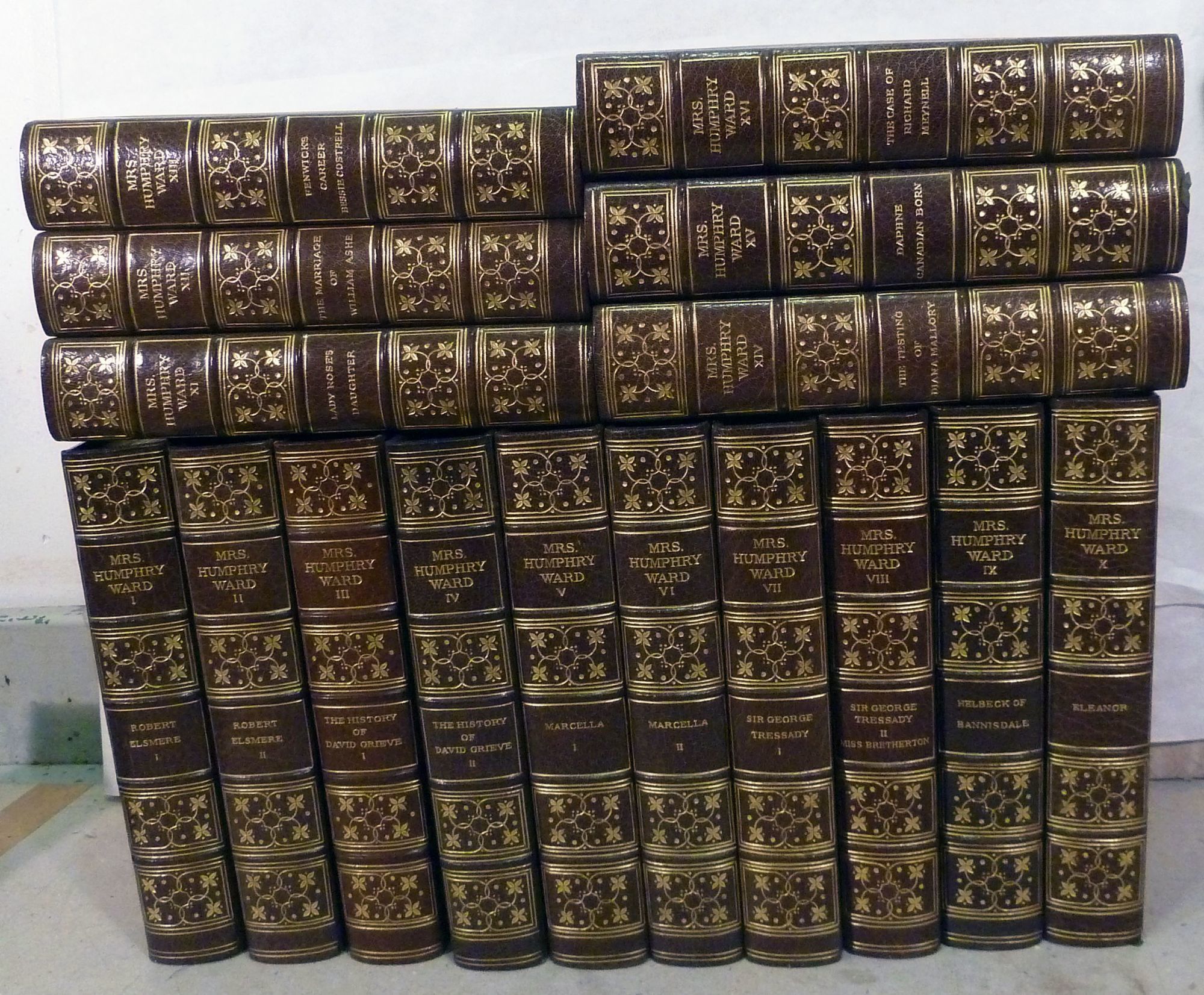 Boston: Houghton Mifflin & Co, 1909. Hardcover. Three quarter brown morocco, light blue marbled endpapers and matching endpapers. Teg. Fine. 16 vols.. 21.5 x 16 cm. Autograph Edition, copy 96 of 750, signed by Mary A. Ward in Volume I. The author, born to a prominent Australian family removed to England when she was five years of age, her father was Tom Arnold (English Professor) and her uncle Matthew Arnold (English poet). Her sister Julia married Leonard Huxley, their sons were Julian and Aldous Huxley. A strong advocate for women's rights, and the founding President of the Women's National Anti-Suffrage League in 1908. Ward's novels contained strong religious subject matter relevant to Victorian values she herself practiced. All illustrations with lettered tissue guards, portrait frontispieces (some colored), and black and white photogravure plates. Raised bands, spine panels richly gilt in floral motifs. Ex-library, but withdrawn by a patron, bookplates front cover pastedown, and rear pockets, small embossed library stamp on titles, interior contents clean, wide text margins.