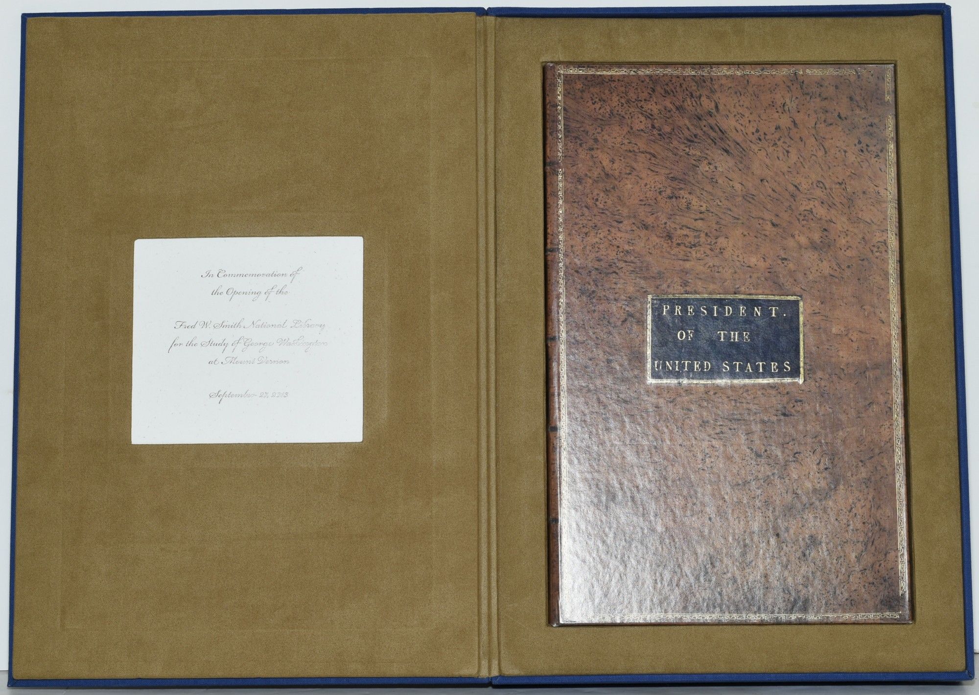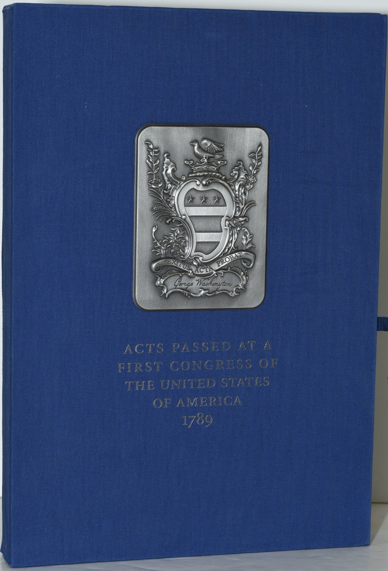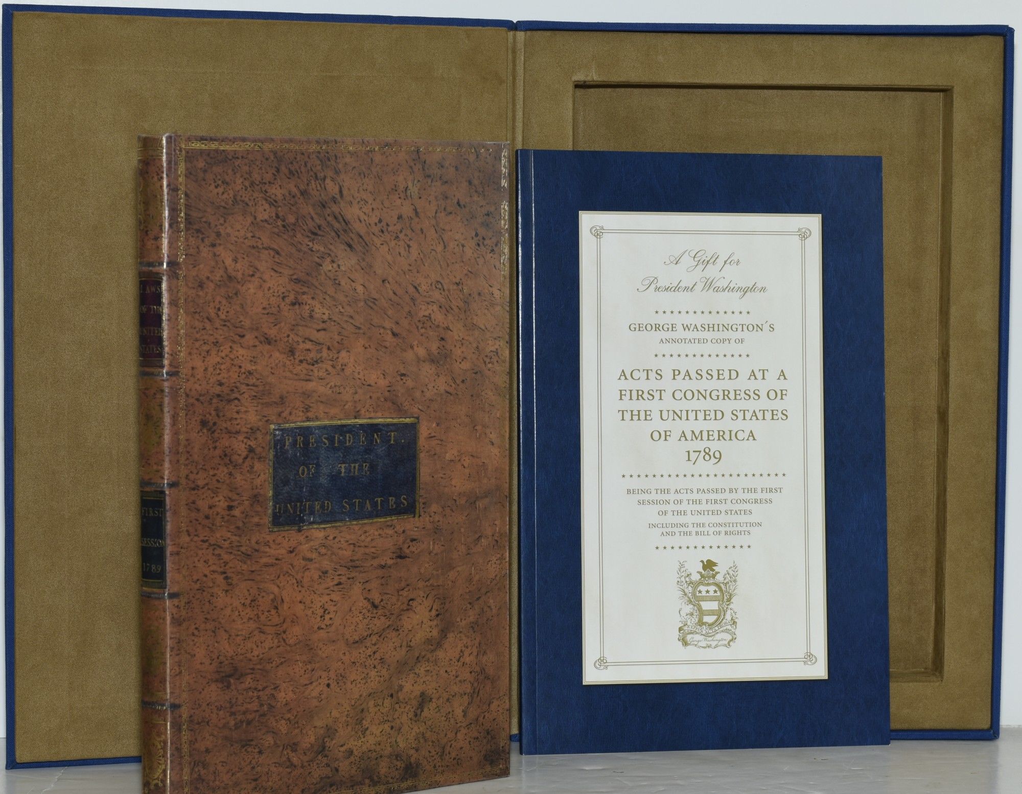 Francis Childs and John Swaine. Facsimile Edition. Hard Cover. Fine binding. A very handsome presentation of a facsimile edition of George Washington's copy of Acts Passed at a Congress of the United States of America, bound in paper covered boards designed to mimic speckled calf with a leather label stamped "President of the United States". Marbled endpapers, and a facsimile of President Washington's bookplate on the pastedown. Housed in a blue suede clamshell box, with a facsimile of the plate for the Washington Bookplate laid down, and stamped "Acts Passed at the First Congress of the United States 1789". On the verso of the lid of the box is the invitation of "In Commemoration of the Opening of the Fred W. Smith National Library for the Study of George Washington at Mount Vernon. September 27, 2013". Laid in is the 43 page pamphlet for the Grand Opening Celebration; with color illustrations and portraits; bound in blue paper with a gold foil pastedown of the Washington bookplate. The whole housed in a printed blue cardstock sleeve. A splendid memento an important event in Washington studies. Fine binding.