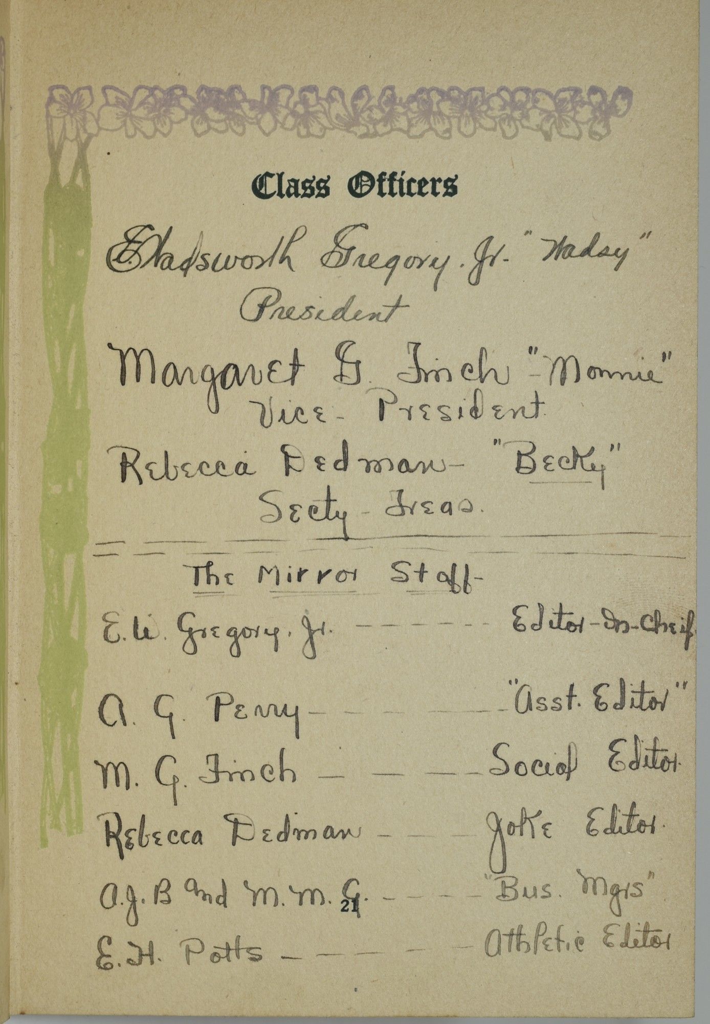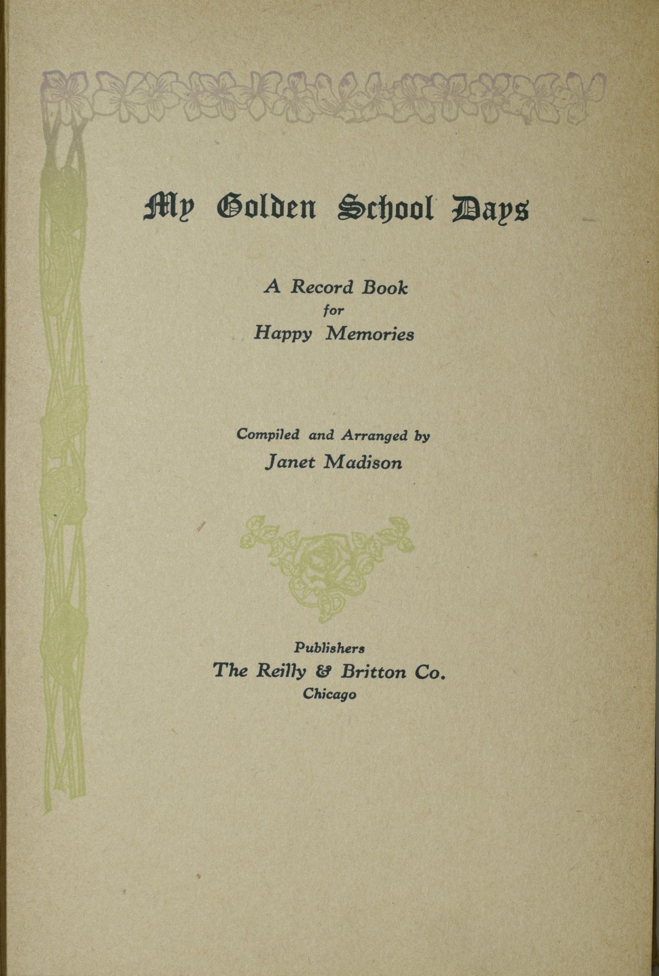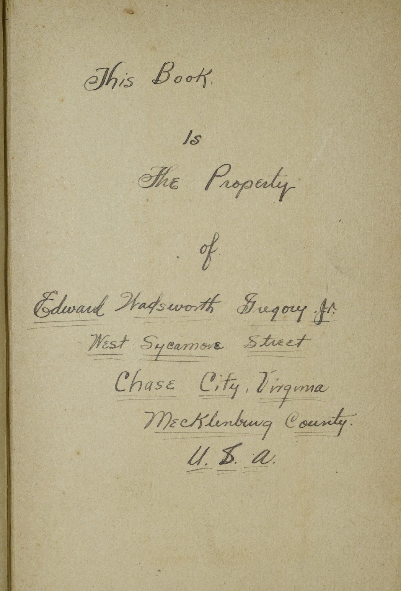 Chicago: Reilly & Britton, 1911. A memory book with quite a bit of penned information, belonging to Edward Wadsworth Gregory. Young Master Gregory was President of the Senior Class, as well as the Editor-in-Chief of "The Mirror". He lists his classmates, and teachers. He also lists his classes (History and Civics "Great discussions - Great class"; Geometry and Trigonometry "Don't ask any questions". Of particular charm is the Feb. 25, 1921 invitation to the Mystery Club at "Their Secluded Den" -- "Your Escort Will Call at Eight". There are Kodak Snap-shots as well. A nice picture of rural Virginia school life in the early 1920's. "Wads" Gregory was buried in Chase City, in 1981.