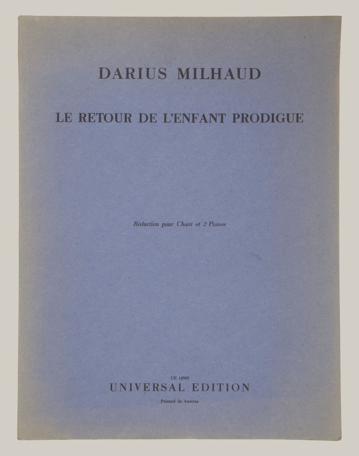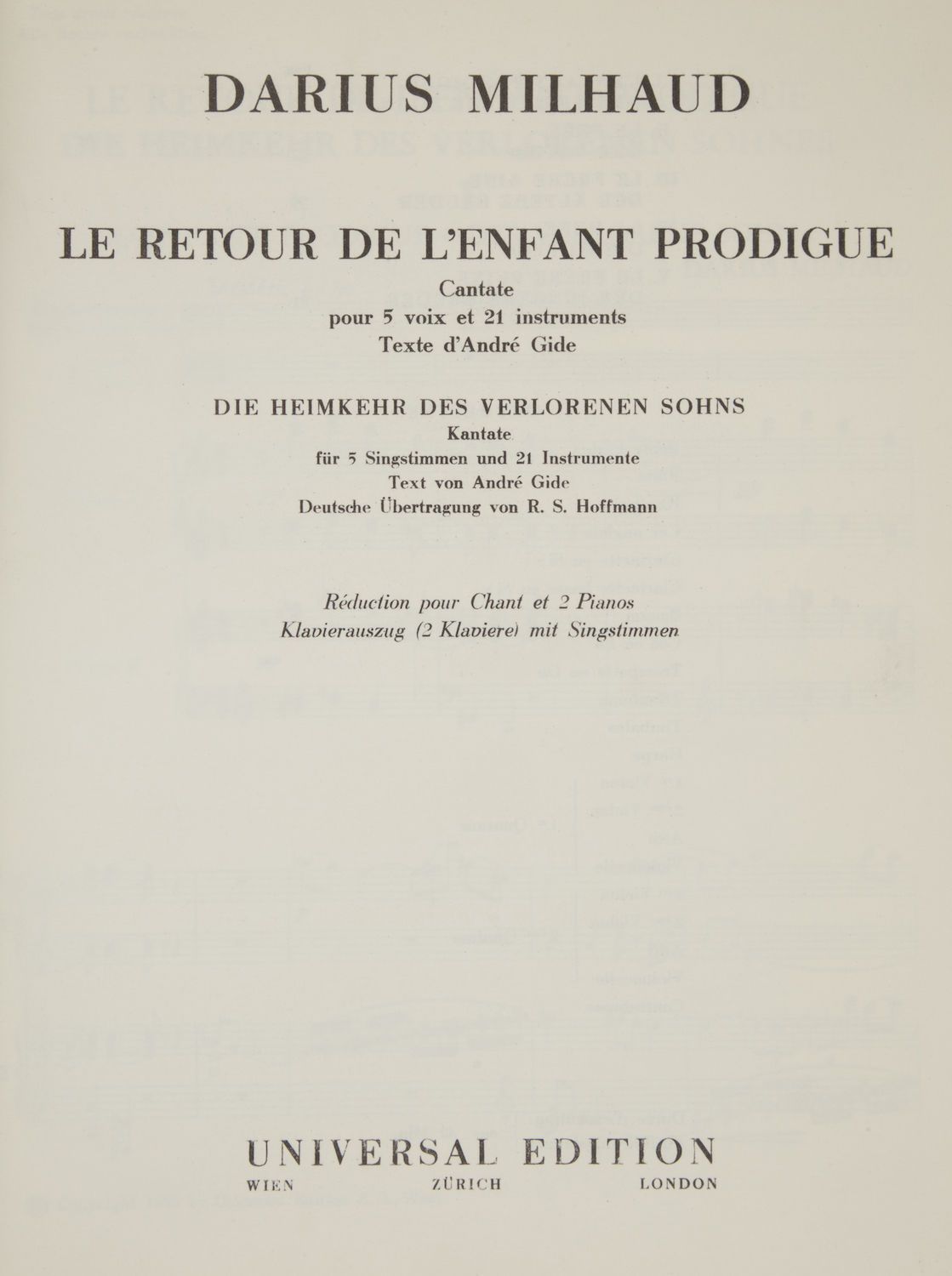 [Op. 42]. Le Retour de l'Enfant Prodigue Cantate pour 5 voix et 21 instruments Texte d'André Gide ... Deutsche Übertragung von R. S. Hoffmann Réduction pour Chat et 2 Pianos. [Piano-vocal score]