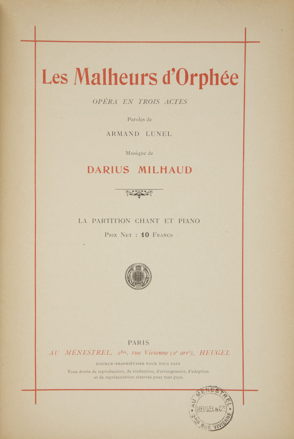 [Op. 85]. Les Malheurs d'Orphée Opéra en Trois Actes Paroles de Armand Lunel ... La Partition Chant et Piano Prix Net: 10 Francs. [Piano-vocal score]