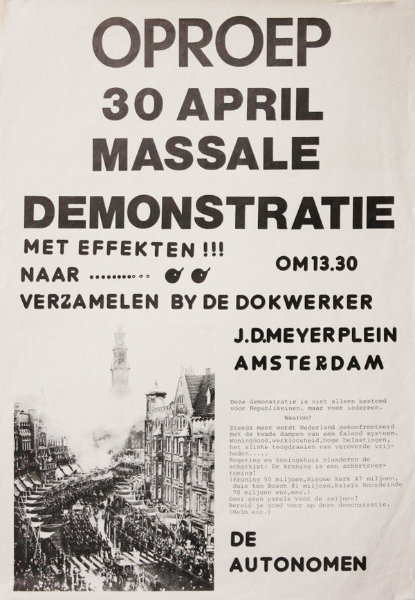Amsterdam: De Autonomen, n.d. but 1980. Original photo-illustrated poster (61x43cm.) printed offset in black on white stock; wrinkling to extremities, tiny closed tear at bottom edge not approaching text, else Very Good and sound. Protest poster calling for a massive demonstration on the day of Queen Beatrix's coronation, April 30, 1980. The photographic illustration dates from March 10, 1966, when a smoke bomb was detonated during the marriage ceremony of Beatrix and Claus von Amsberg. The poster reminds participants to come prepared with helmets, etc. In fact, the protest would devolve into a riot with the public clashing against mounted and riot police, one man beaten so badly he would lose his hearing.