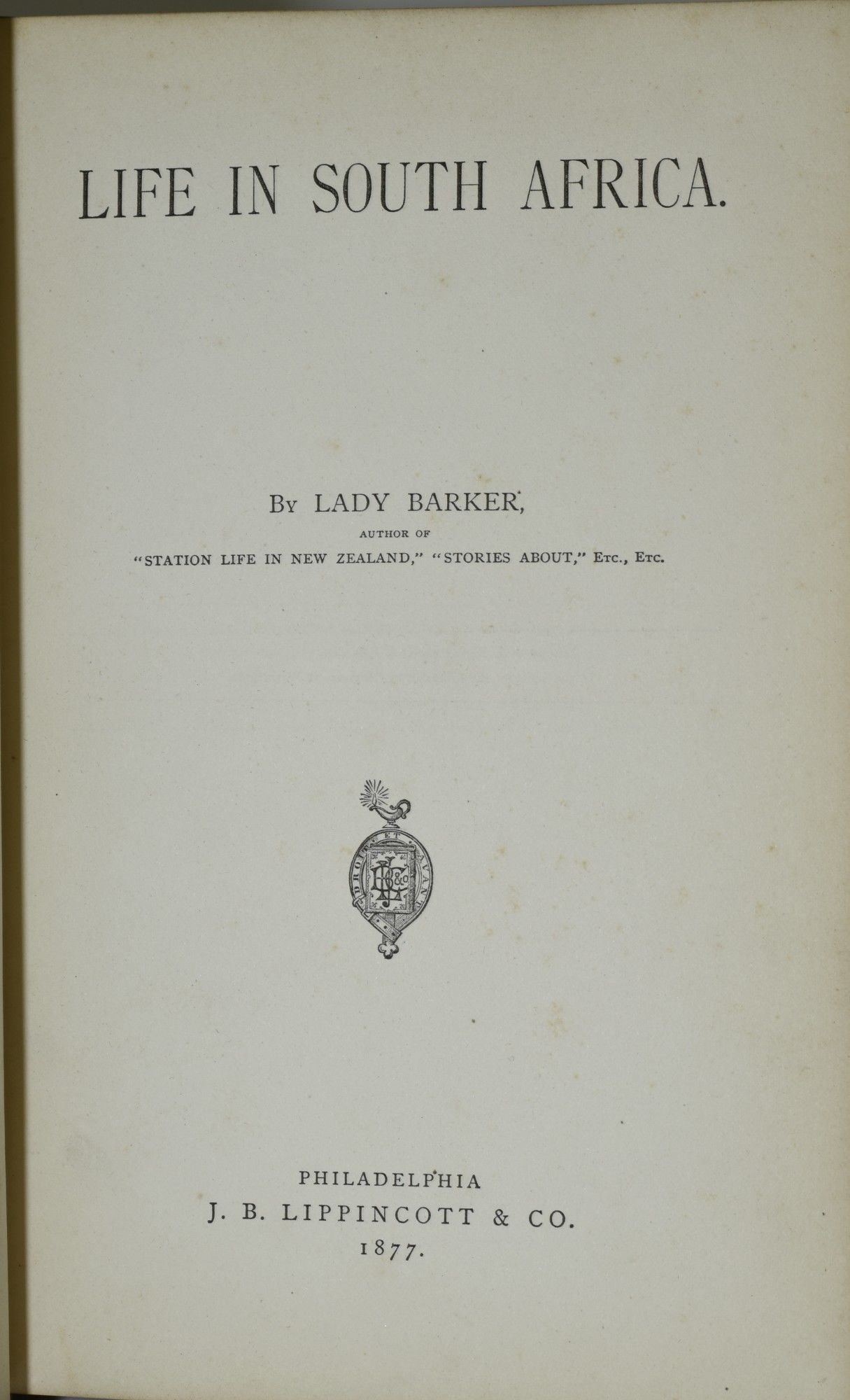 Philadelphia: J. B. Lippincott & Co, 1877. First American Edition. Hard Cover. Very Good+ binding. Novelist and journalist Mary Anne Barker and her second husband Frederick Napier Broome traveled extensively, and both became journalists, Lady Barker becoming a correspondent for The Times. Life in South Africa consists of her chatty, anecdotal and illuminating letters. This the First American Edition; the English edition issued the same year under the title, "A Year's Housekeeping in South Africa". In the publisher's brown cloth, with minor loss to the top of the spine; 136pp.; double column text plus 4pp. ads. Previous owner name on the endpapers; some soiling to the rear endpapers.; minor spotting to the rear board. Very Good+ binding.