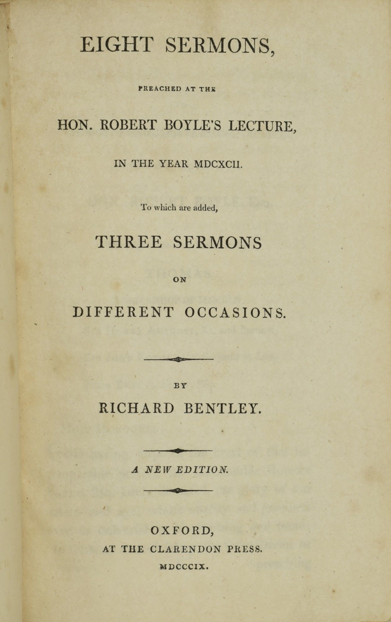 Oxford: The Clarendon Press, 1809. A New Edition. Full Leather. Very Good binding. An early nineteenth century edition of Eight Sermons, Preached at the Hon. Robert Boyle's Lecture [...] to which are added Three Sermons on Different Occasions. The first year of the 'Boyle Lectures', given in 1692 by Richard Bentley. Variously titled "A Confutation of Atheism [...]" with three additional lectures by Bentley, the lectures focus on Newtonian Physics and their evidence of Intelligent Design. Armorial bookplate of Charles Almeric Belli, Vicar of Prittlewell, Witham, and South Weald, on the front pastedown. Foxing to the endpapers; boards reattached by a conservator, with Japanese tissue repair to the extremities of the spine. Full calf. Very Good. (DNB II, 306-314. ). Very Good binding.