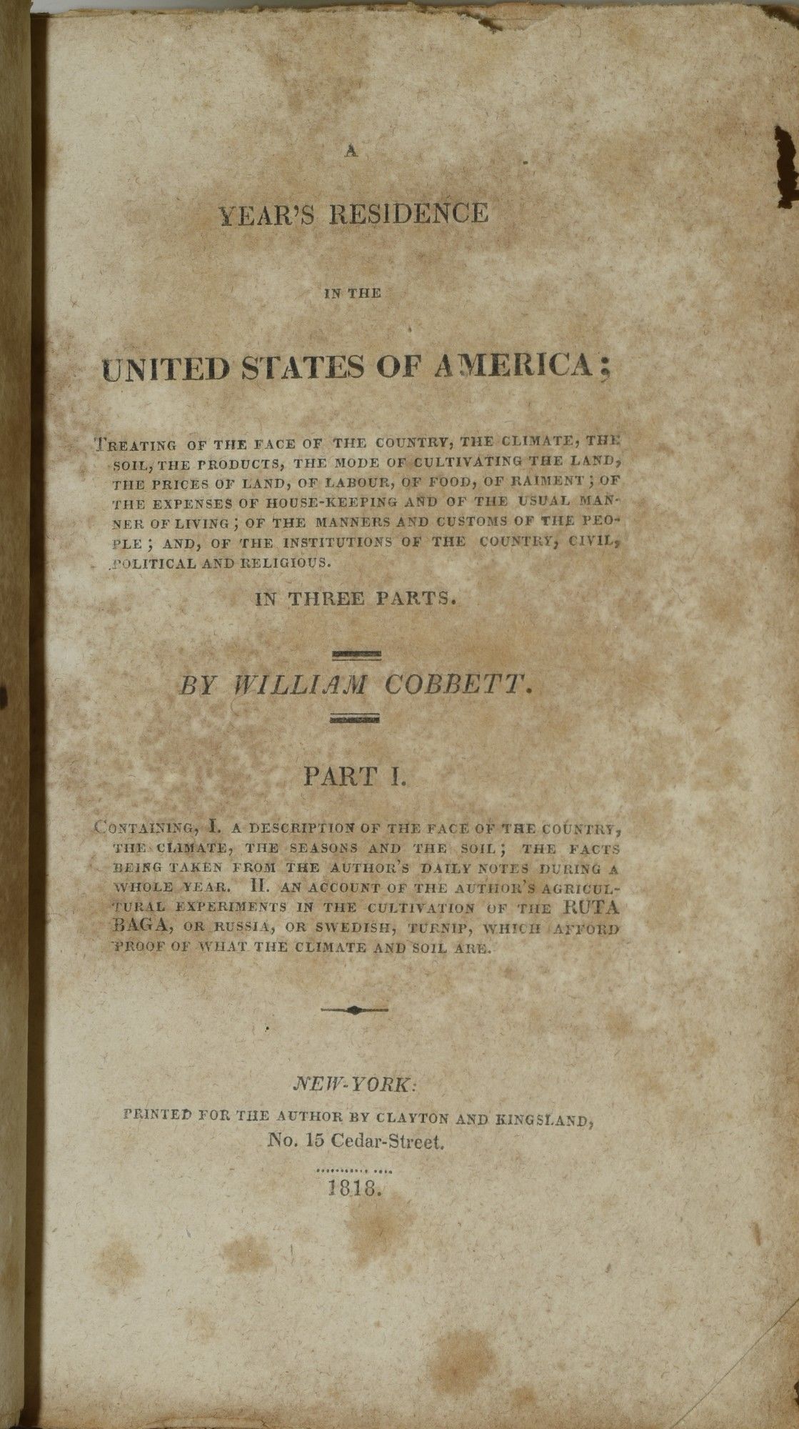 A YEAR'S RESIDENCE IN THE UNITED STATES OF AMERICA: IN THREE PARTS. PART I: CONTAINING I, A DESCRIPTION OF THE FACE OF THE COUNTRY, THE CLIMATE, THE SEASONS AND THE SOIL; THE FACTS BEING TAKEN FROM THE AUTHOR'S DAILY NOTES DURING A WHOLE YEAR. II. AN ACCOUNT OF THE AUTHOR'S AGRICULTURAL EXPERIMENTS IN THE CULTIVATION OF THE RUTABAGA, OR RUSSIA, OR SWEDISH, TURNIP, WHICH AFFORD PROOF OF WHAT THE CLIMATE AND SOIL ARE