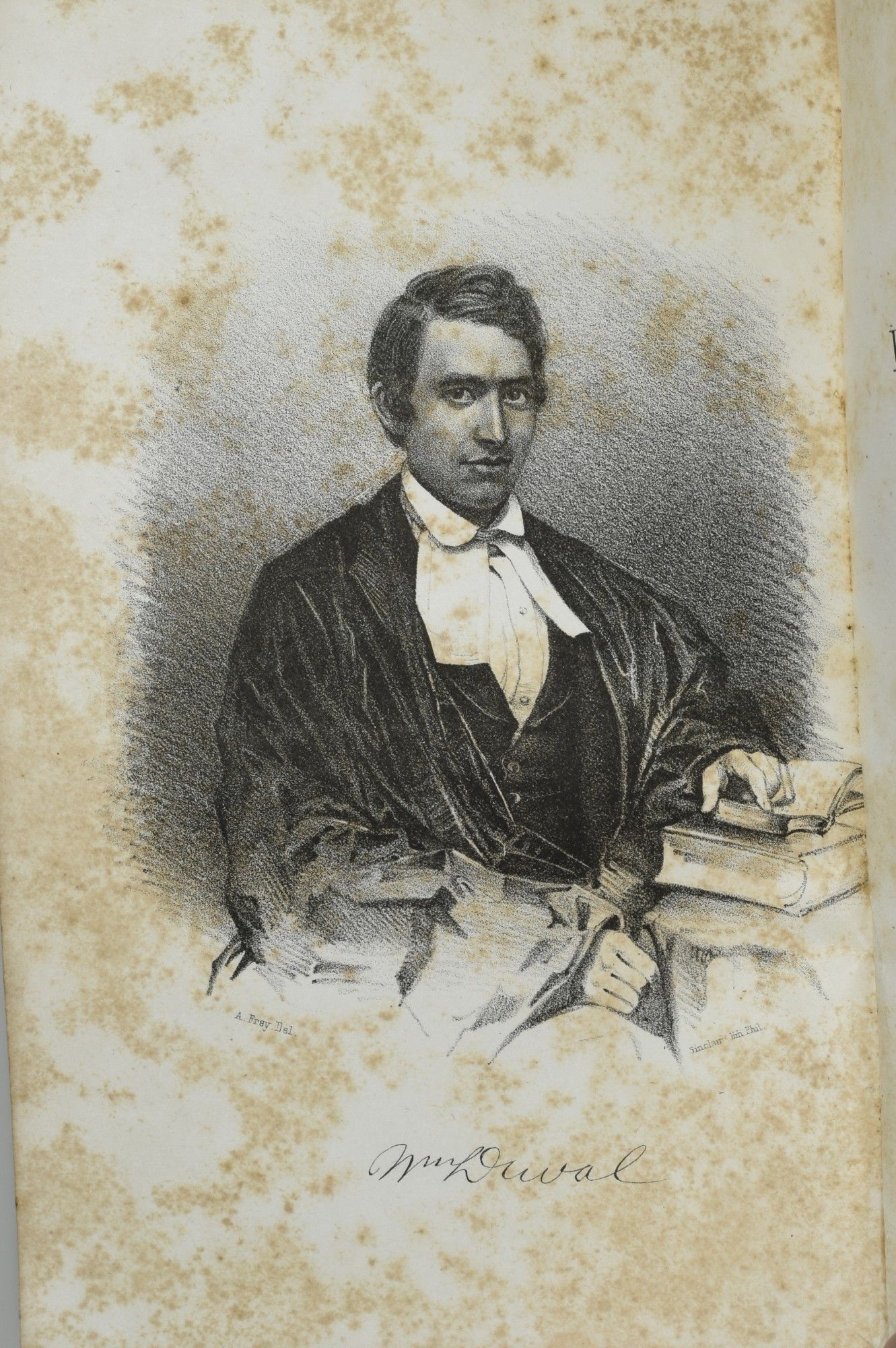 Richmond, VA: J. W. Randolph, 1854. Hard Cover. Very Good binding. C. Walker's Memoir and Sermons of the Rev. William Duval, City Missionary, Richmond. Portrait frontispiece, foxed. Slight, scattered foxing throughout. Binding cocked. Blue embossed cloth with gilt lettering on the spine. Very Good binding.