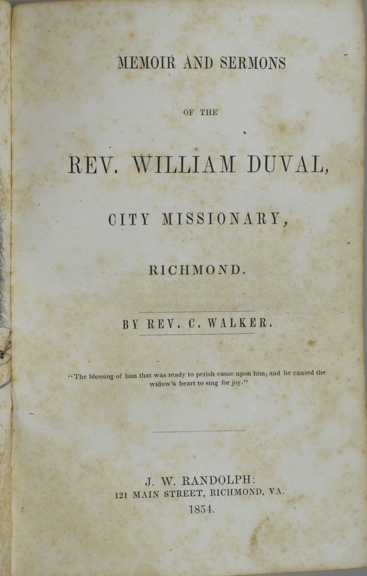 [RICHMOND] MEMOIR AND SERMONS OF THE REV. WILLIAM DUVAL, CITY MISSIONARY, RICHMOND