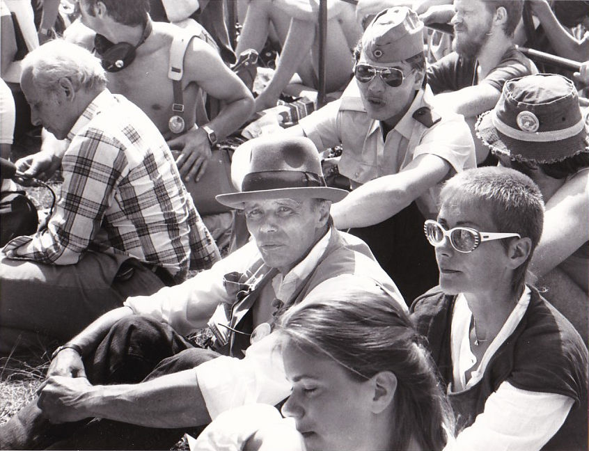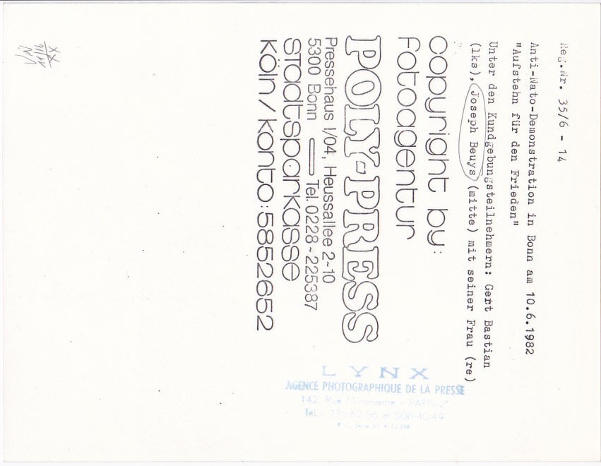 N.p.: N.p., 1982. Vintage photograph of artist Joseph Beuys sitting amongst a crowd at an anti-NATO demonstration held in Bonn, Germany on October 6, 1982. Also scene in the photograph are German Green Party Member of Parliament Gert Bastian, and Beuys' wife, Eva Wurmbach. With the stamps of press agencies Poly-Press and Lynx on the verso.