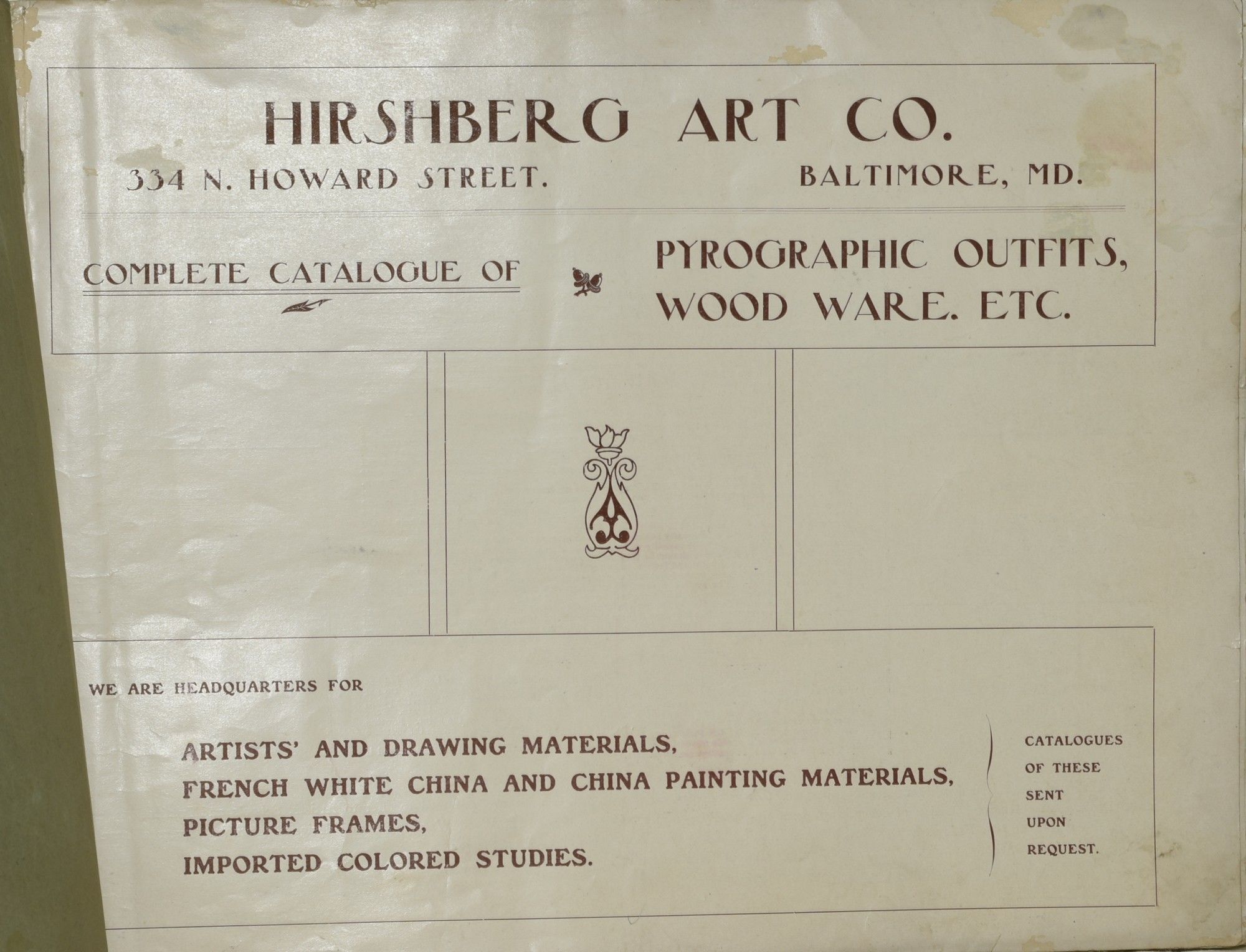 Baltimore, MD: Hirshberg Art Co, n.d.. Soft Cover. Very Good binding. A catalogue of art supplies from the Hirshberg Art Company, beginning with a section of supplies for artistic Pyrography. Illustrations and prices throughout. Some wear to the binding; small closed tears and minor loss at the extremities of the spine. Stapled, printed paper wrappers. Royal Octavo. Very Good. Very Good binding.